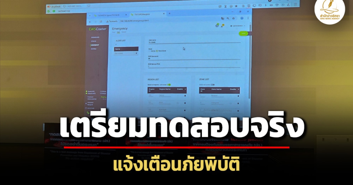 สำนักข่าวอิศรา (www.isranews.org) รายงานว่า เมื่อวันที่ 14 พฤษภาคม 2568 ที่สถานีวิทยุโทรทัศน์กองทัพบก มีการทดลอง ทดสอบระบบการแจ้งเตือนภัยพิบัติหรือเหตุฉุกเฉินบนโครงข่ายโทรทัศน์ภาคพื้นดินแบบเสมือนจริงของสถานีวิทยุโทรทัศน์กองทัพบก ในที่ประชุมคณะทำงานเพื่อศึกษาและเตรียมการพัฒนาระบบแจ้งเตือนภัยพิบัติหรือเหตุฉุกเฉิน (Emergency Warning System: EWS) ผ่านโครงข่ายโทรทัศน์ภาคพื้นดินในระบบดิจิทัล โดยมี กสทช. ศาสตราจารย์กิตติคุณ ดร.พิรงรอง รามสูต ที่ปรึกษาคณะทำงานฯ และนายฉันทพัทธ์ ขำโคกกรวด นักวิชาการนโยบายและแผนเชี่ยวชาญพิเศษ รักษาการแทนรองเลขาธิการ กสทช. สายงานกิจการกระจายเสียงและโทรทัศน์ ในฐานะหัวหน้าคณะทำงานฯ พร้อมด้วยผู้บริหาร สำนักงาน กสทช. และผู้แทนจากหน่วยงานที่เกี่ยวข้องเข้าร่วม