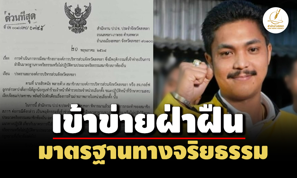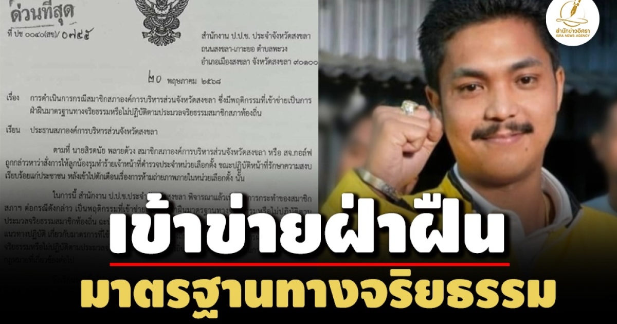 ป.ป.ช.สงขลา ชี้พฤติการณ์ 'สิรตนัย พลายด้วง' หรือ สจ.กอล์ฟ ถูกกล่าวหาสั่งการลูกน้องรุมทำร้ายตำรวจ หลังโดนตักเตือนห้ามถ่ายภาพในหน่วยเลือกตั้ง เข้าข่ายฝ่าฝืนมาตรฐานทางจริยธรรมสมาชิกท้องถิ่น ทำหนังสือแจ้งประธานสภา อบจ.ดำเนินการตามระเบียบ-กฎหมายที่เกี่ยวข้อง รายงานผลให้ทราบภายใน 30 วัน