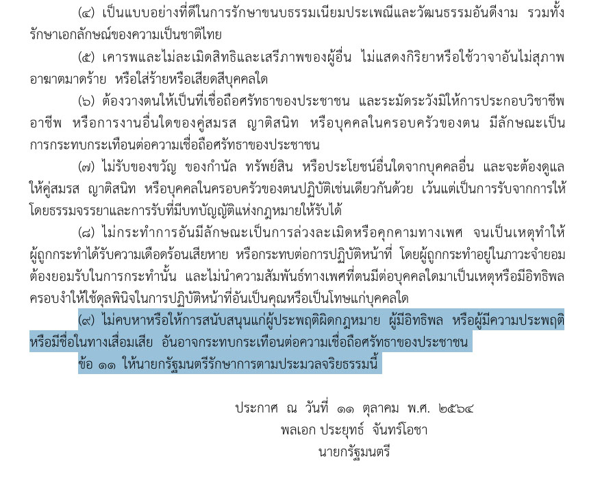 เพราะตามประมวลจริยธรรมของข้าราชการการเมือง พ.ศ.2564 ฉบับนี้ ที่เกิดขึ้นในสมัยรัฐบาล พล.อ.ประยุทธ์ จันทร์โอชา อดีตนายกรัฐมนตรี เมื่อปี 2564 ประกาศลงราชกิจจานุเบกษา เมื่อวันที่ 26 ตุลาคม 2564 ที่ใช้เป็นหลักเกณฑ์ในการประพฤติปฏิบัติอย่างมีคุณธรรมของข้าราชการการเมือง