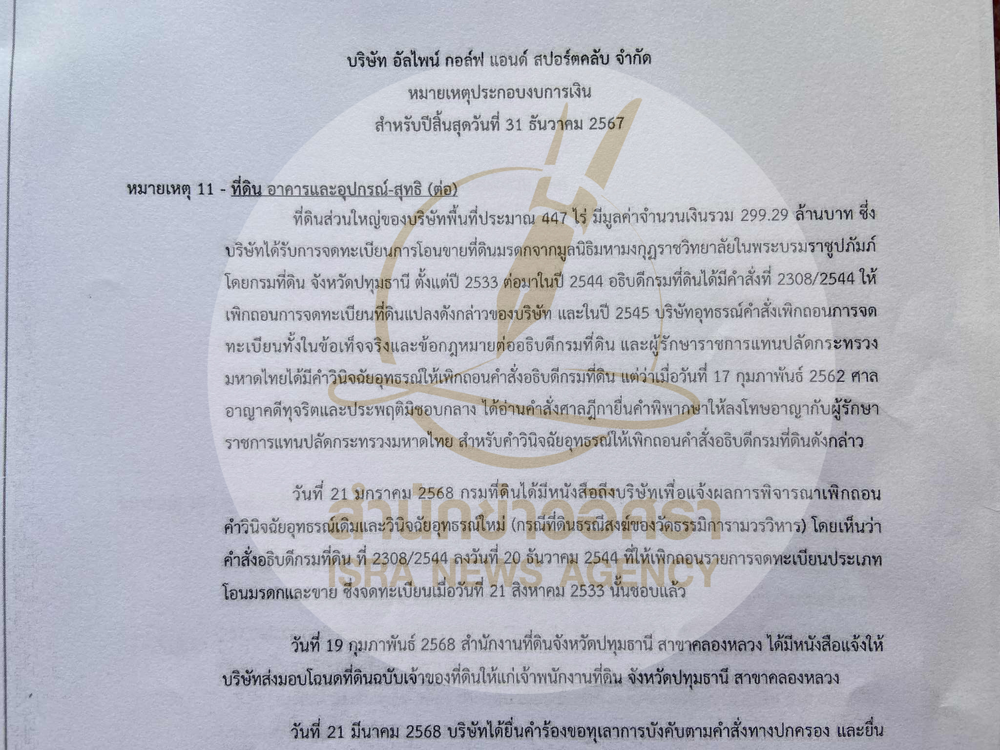 สำนักข่าวอิศราตรวจสอบพบว่า เมื่อวันที่ 21 พฤษภาคม 2568 บริษัท อัลไพน์ กอล์ฟ แอนด์ สปอร์ตคลับ ได้นำส่งงบการเงินต่อกรมพัฒนาธุรกิจการค้า โดยแจ้งในหมายเหตุงบการเงินว่า ที่ดินส่วนใหญ่ของบริษัทพื้นที่ประมาณ 447 ไร่ มีมูลค่าจำนวนเงินรวม 299.29 ล้านบาท ซึ่งบริษัทได้รับการจดทะเบียนการโอนขายที่ดินมรดกจากมูลนิธิมหามกุฎราชวิทยาลัยในพระบรมราชูปถัมภ์ โดยกรมที่ดิน จังหวัดปทุมธานี ตั้งแต่ปี 2533 ต่อมาในปี 2544 อธิบดีกรมที่ดินได้มีคำสั่งที่ 2308/254444 ให้เพิกถอนการจดทะเบียนที่ดินแปลงดังกล่าวของบริษัท และในปี 2545 บริษัทอุทธรณ์คำสั่งเพิกถอนการจดทะเบียนทั้งในข้อเท็จจริงและข้อกฎหมายต่ออธิบดีกรมที่ดิน และผู้รักษาราชการแทนปลัดกระทรวงมหาดไทยได้มีคำวินิจฉัยอุทธรณ์ให้เพิกถอนคำสั่งอธิบดีกรมที่ดิน แต่ว่าเมื่อวันที่ 17 กุมภาพันธ์ 2562 ศาลอาญาคดีทุจริตและประพฤติมิชอบกลางได้อ่านคำสั่งศาลฎีกายืนคำพิพากษาให้ลงโทษอาญากับผู้รักษาราชการแทนปลัดกระทรวงมหาดไทย สำหรับคำวินิจฉัยอุทธรณ์ให้เพิกถอนคำสั่งอธิบดีกรมที่ดินดังกล่าว