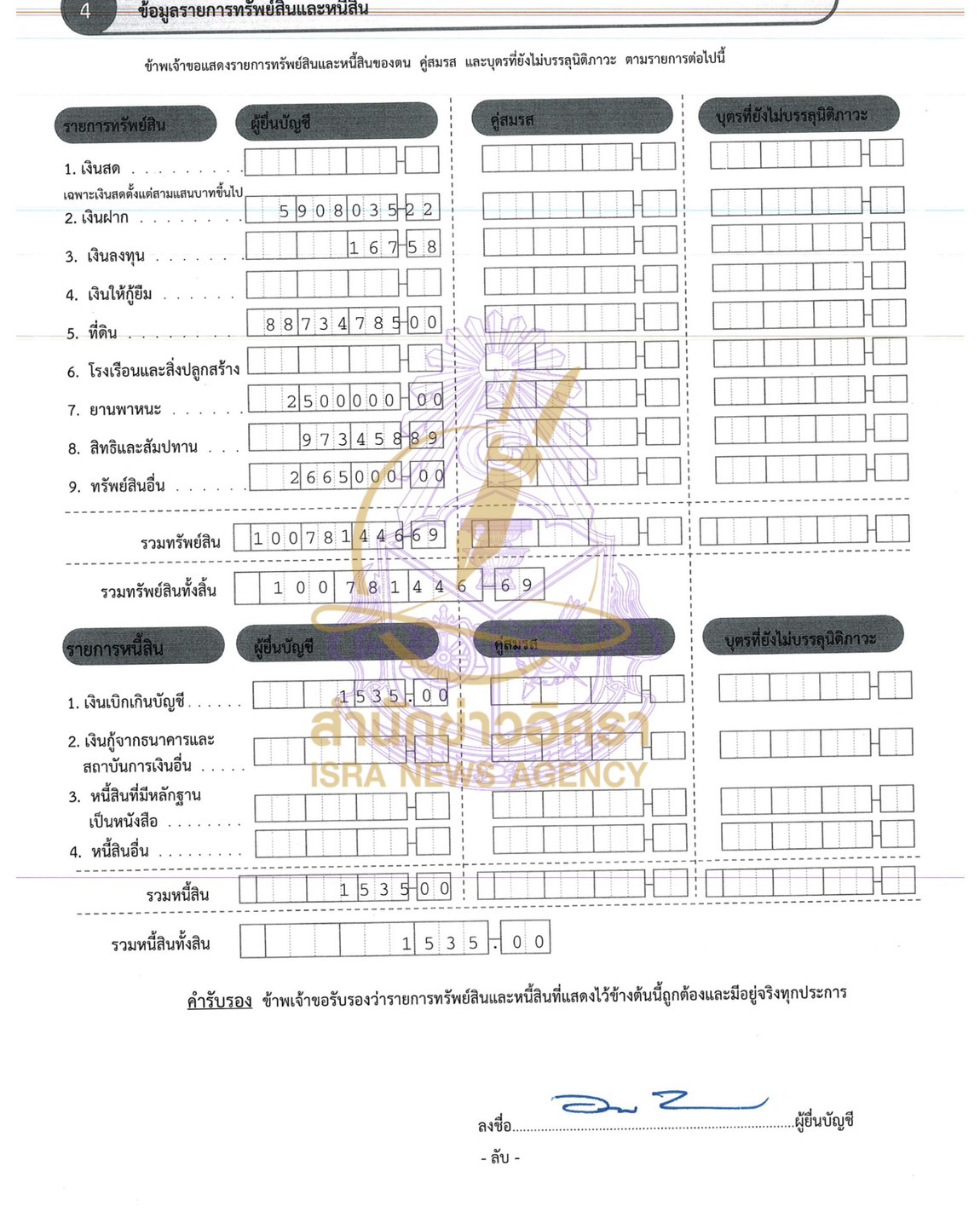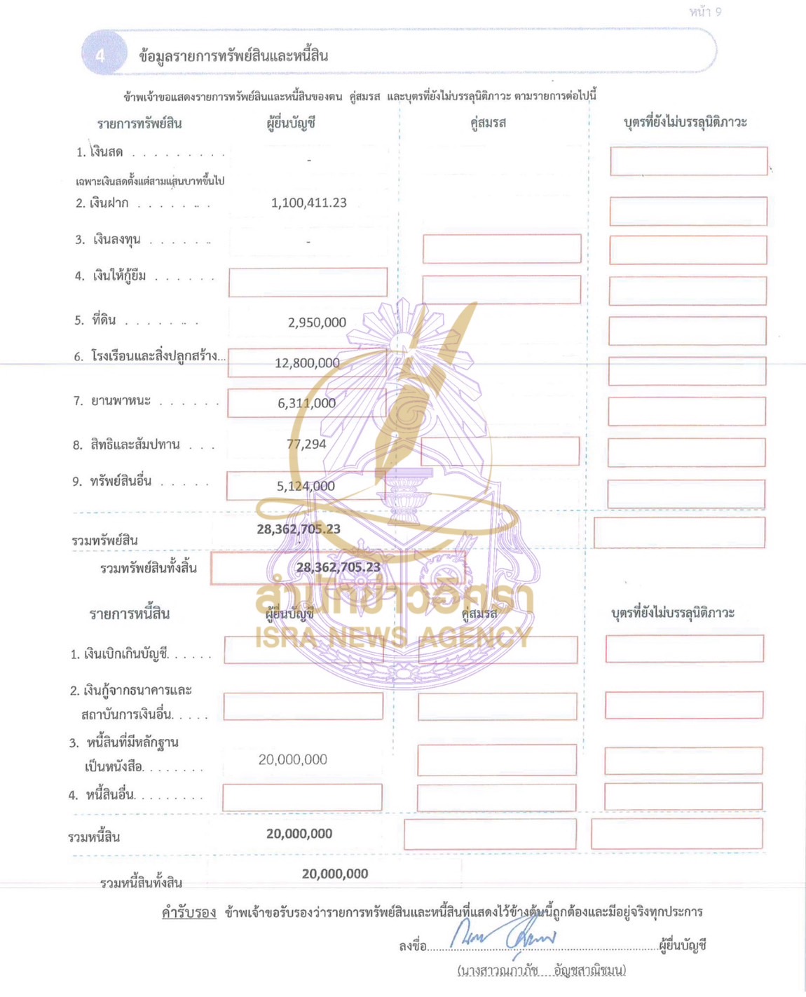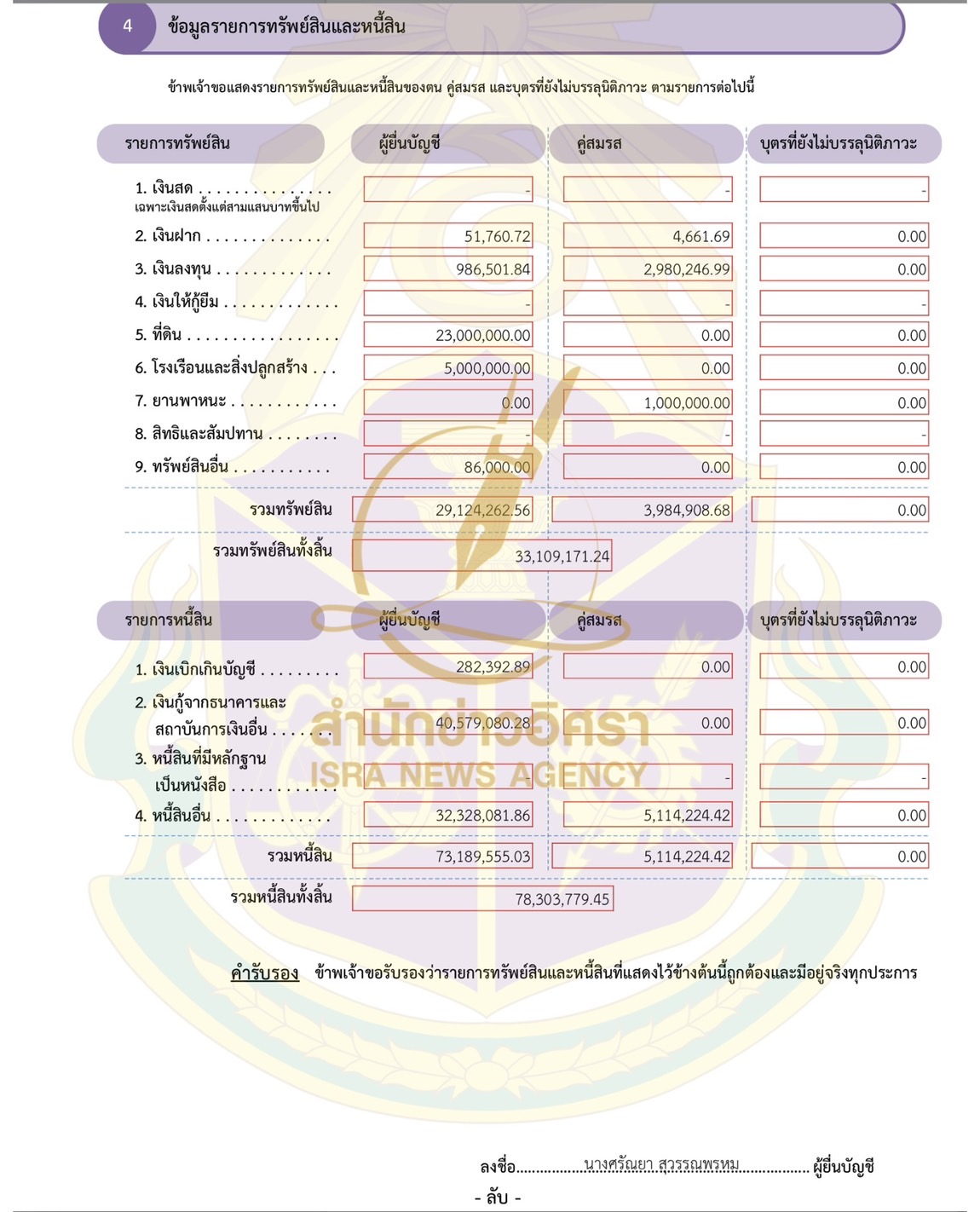 นางศรัณยา แจ้งมีทรัพย์สิน 29,124,262 บาท ประกอบด้วย เงินฝาก 51,760 บาท เงินลงทุน 986,501 บาท ที่ดิน 23,000,000 บาท โรงเรือนและสิ่งปลูกสร้าง 5,000,000 บาท ทรัพย์สินอื่น 86,000 บาท แจ้งมีหนี้สิน 73,189,555 บาท