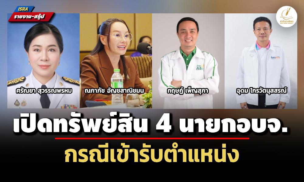 ป.ป.ช. เปิดทรัพย์สิน 4 นายกองค์การบริหารส่วนจังหวัด กรณีเข้ารับตำแหน่ง 'อุดม ไกรวัตนุสสรณ์' อบจ.สมุทรสาคร มากสุด 100 ล.-'กฤษฏ์ เพ็ญสุภา' อบจ.พิจิตร 44 ล.-'ศรัณยา สุวรรณพรหม' อบจ.หนองบัวลำภู 33 ล.-'ณภาภัช อัญชสาณิชมน' อบจ.ปราจีนบุรี 28 ล.