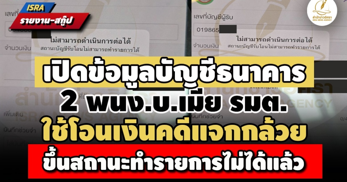 • เปิดข้อมูลบัญชีธนาคาร 2 พนง.บ.เมีย รมต.ใช้โอนเงินคดีแจกกล้วย ขึ้นสถานะทำรายการไม่ได้แล้ว