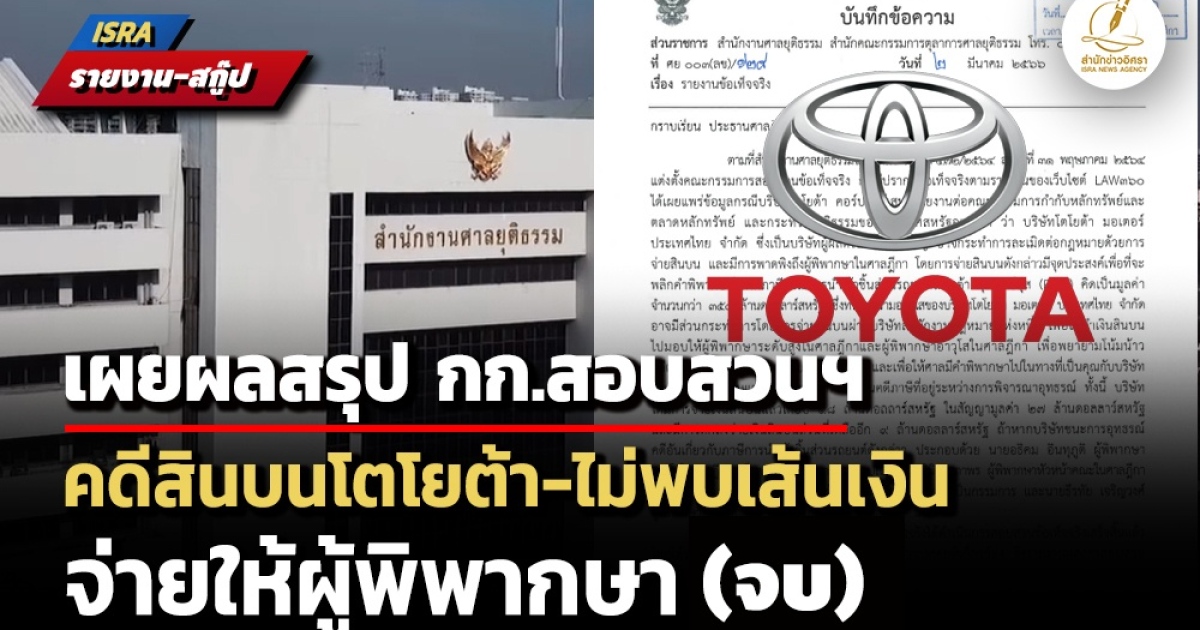 ก่อนหน้านี้ สำนักข่าวอิศรา นำรายงานผลการสอบสวนของคณะกรรมการสอบสวนสำนักงานศาลยุติธรรม ที่มีการออกผลสรุปการดำเนินงานคณะกรรมการระบุว่าไม่พบพฤติการณ์บ่งชี้ได้ว่ามีผู้พิพากษารับเงินสินบนจากโตโยต้า ส่วนแรกมานำเสนอไปแล้ว