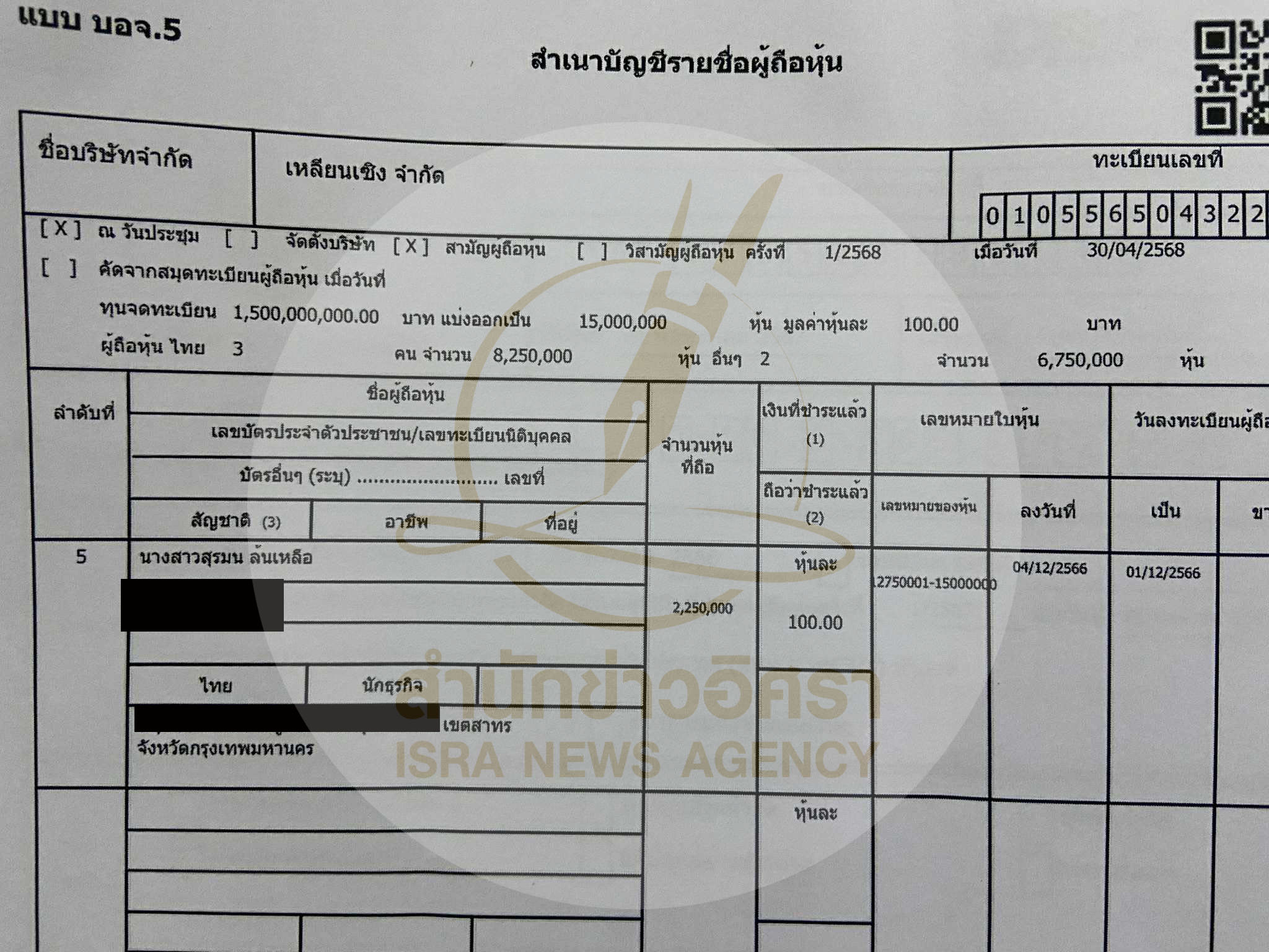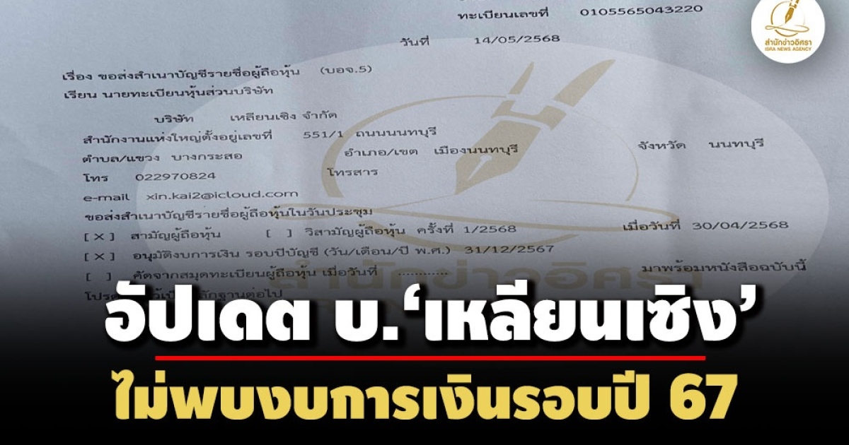 • บัญชีผู้ถือหุ้นล่าสุด บ.ทุนจีน‘เหลียนเซิง’ ยังมีชื่อ 3 คนไทย 825 ล. –ไม่พบงบฯรอบปี 67