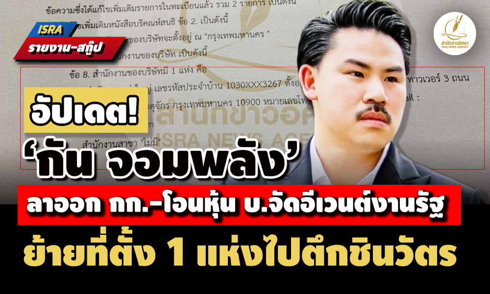 • ‘กัน จอมพลัง’ ลาออก กก.-โอนหุ้น บ.จัดอีเวนต์งานรัฐ /ย้ายที่ตั้ง 1 แห่งไปตึกชินวัตร