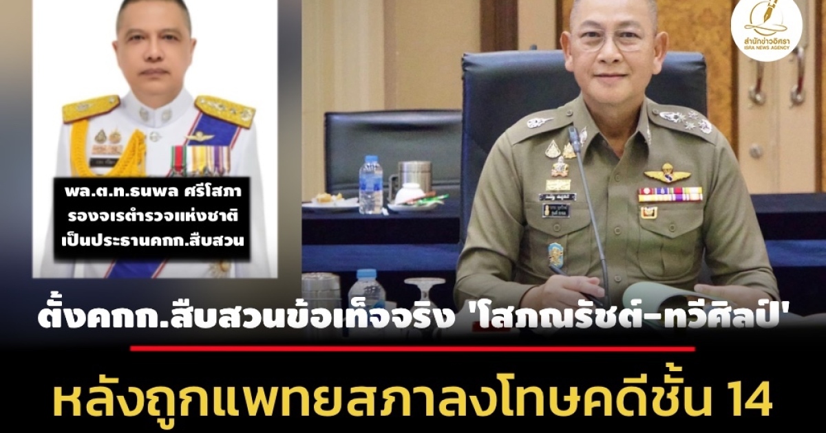 'พล.ต.อ.กิตติ์รัฐ พันธุ์เพ็ชร์' สั่งตั้งคณะกรรมการสืบสวนข้อเท็จจริง 'พล.ต.ท.โสภณรัชต์ สิงหจารุ-พล.ต.ท.ทวีศิลป์ เวชวิทารณ์' หลังจากถูกแพทยสภาลงโทษพักใช้ใบอนุญาตประกอบวิชาชีพ กรณีเกี่ยวข้อง 'ทักษิณ ชินวัตร' นอนรพ.ตร. ชั้น 14