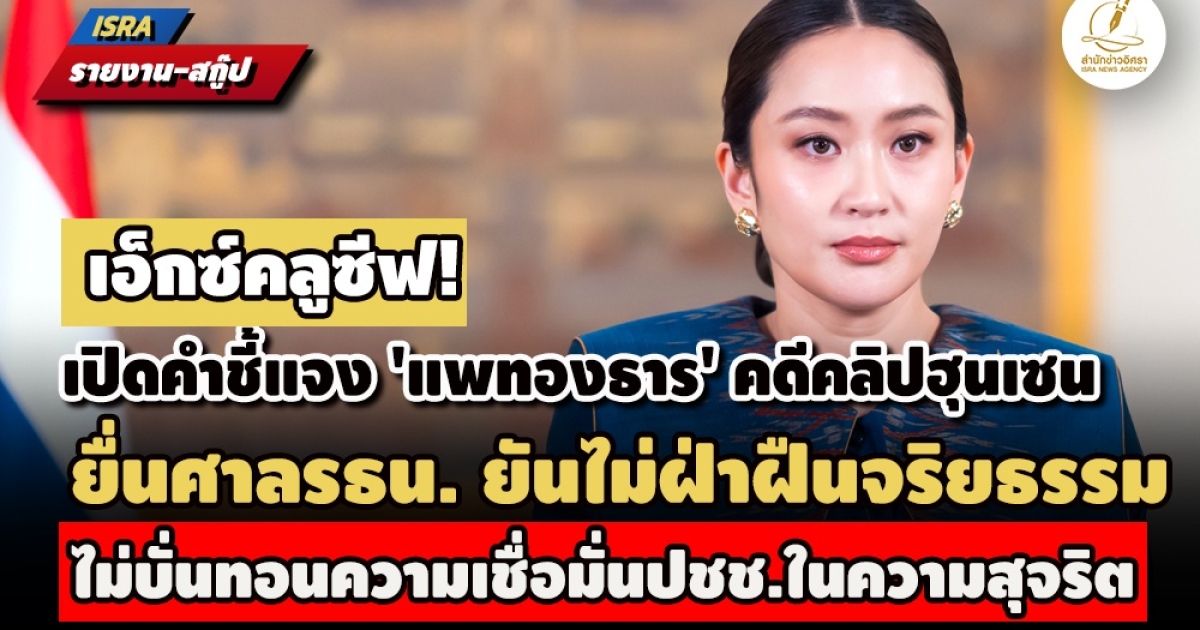 "...น.ส.แพทองธาร ชินวัตร ได้ยื่นคำชี้แจงคดีนี้ต่อศาลรัฐธรรมนูญ โดยยืนยันว่า การกระทำของตนเองตามข้อกล่าวหาของผู้ร้อง ไม่เป็นการฝ่าฝืนหรือไม่ปฏิบัติตามประมวลจริยธรรมของข้าราชการการการเมือง พ.ศ. 2564 แต่อย่างใด อีกทั้งการกระทำของตนเองก็ไม่ได้ก่อให้เกิดความเสื่อมเสียต่อเกียรติภูมิของตำแหน่งนายกรัฐมนตรี หรือบั่นทอนความเชื่อมั่นของประชาชนในความสุจริตและเหมาะสมในการดำรงตำแหน่งแต่ประการใด..."