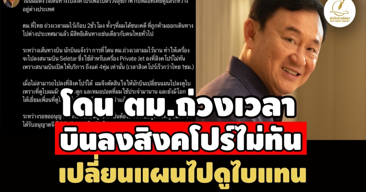 ถึงที่หมาย 01.49 น.! 'ทักษิณ' โพสต์ผ่าน x แจงตั้งใจไปสิงคโปร์ตรวจสุขภาพ แต่โดน ตม.ถ่วงเวลาบินลงไม่ทัน เปลี่ยนแผนไปหาหมอกระดูกที่ ‘ดูไบ’ พร้อมเยี่ยมเพื่อนแทน เผยบินวนรออยู่พักใหญ่ก่อนได้รับอนุญาต ยันกลับไทยแน่ไม่เกิน 8 ก.ย. ไปศาลฯ ฟังคำตัดสินศาลคดีติดคุกทิพย์ ด้วยตัวเอง 9 ก.ย.