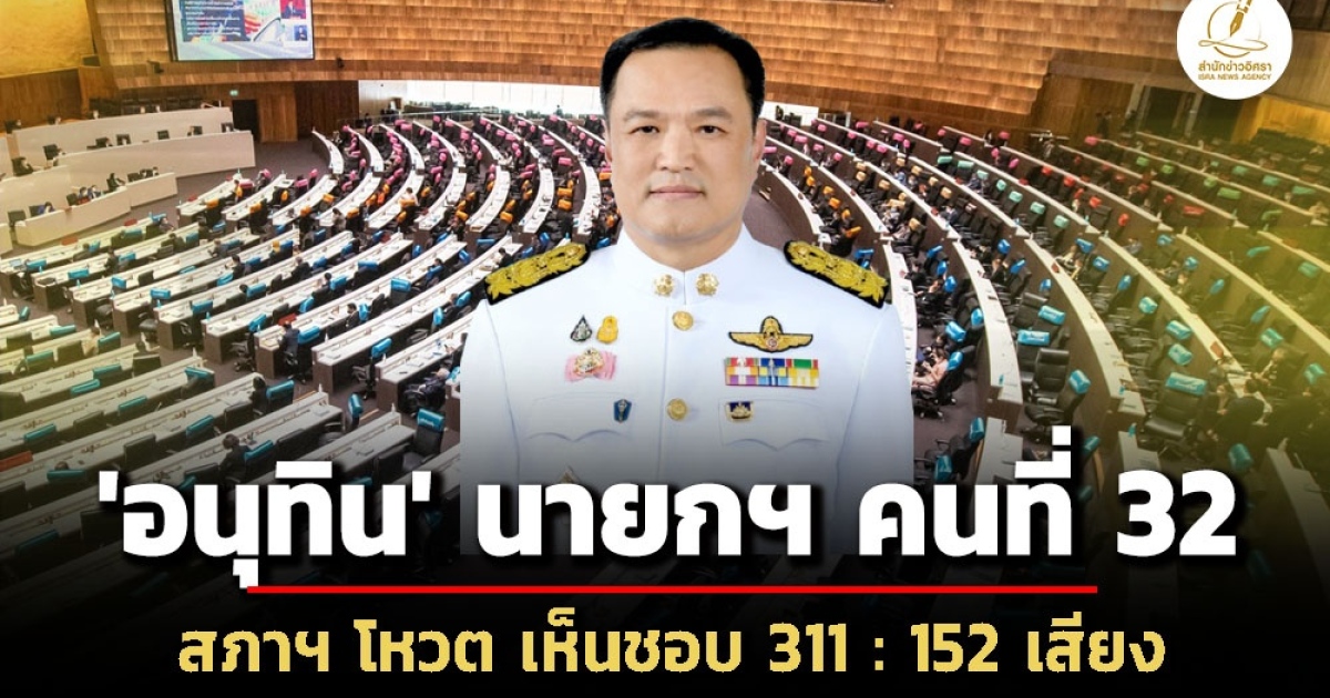 ที่ประชุมสภาผู้แทนราษฎร เห็นชอบ ‘อนุทิน ชาญวีรกุล’ แคนดิเดตนายกรัฐมนตรีจากพรรคภูมิใจไทย เป็นนายกรัฐมนตรีคนใหม่-คนที่ 32 ด้วยคะแนนเสียงเห็นด้วยเกินครึ่ง หรือ 311 เสียง ชนะ ‘ชัยเกษม นิติสิริ’ แคนดิเดตนายกฯ พรรคเพื่อไทย ได้คะแนนเห็นด้วย 152 เสียง