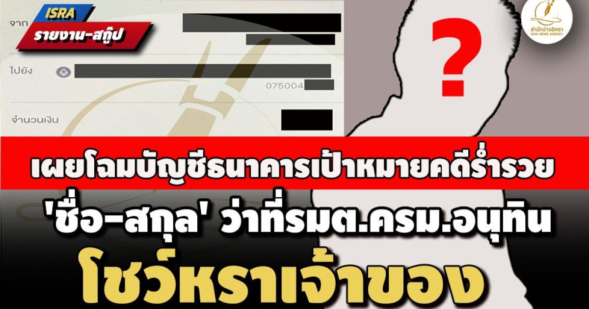 'อิศรา' ตามแกะรอยบัญชีธนาคารเป้าหมายคดีร่ำรวยผิดปกติ ว่าที่ รมต.ครม.อนุทิน หลังโดนสอบเชิงลึกพบเส้นทางเงินปริศนาหลายล้าน โอนเข้าโดยไม่ทราบเหตุผลที่มาชัดเจน เตรียมชงคกก.ชุดใหญ่ตั้งไต่สวน พบเป็นของแบงก์กรุงเทพ ทดลองโอนเงินเข้าเจอ 'ชื่อ-สกุล' โชว์หราเจ้าของ