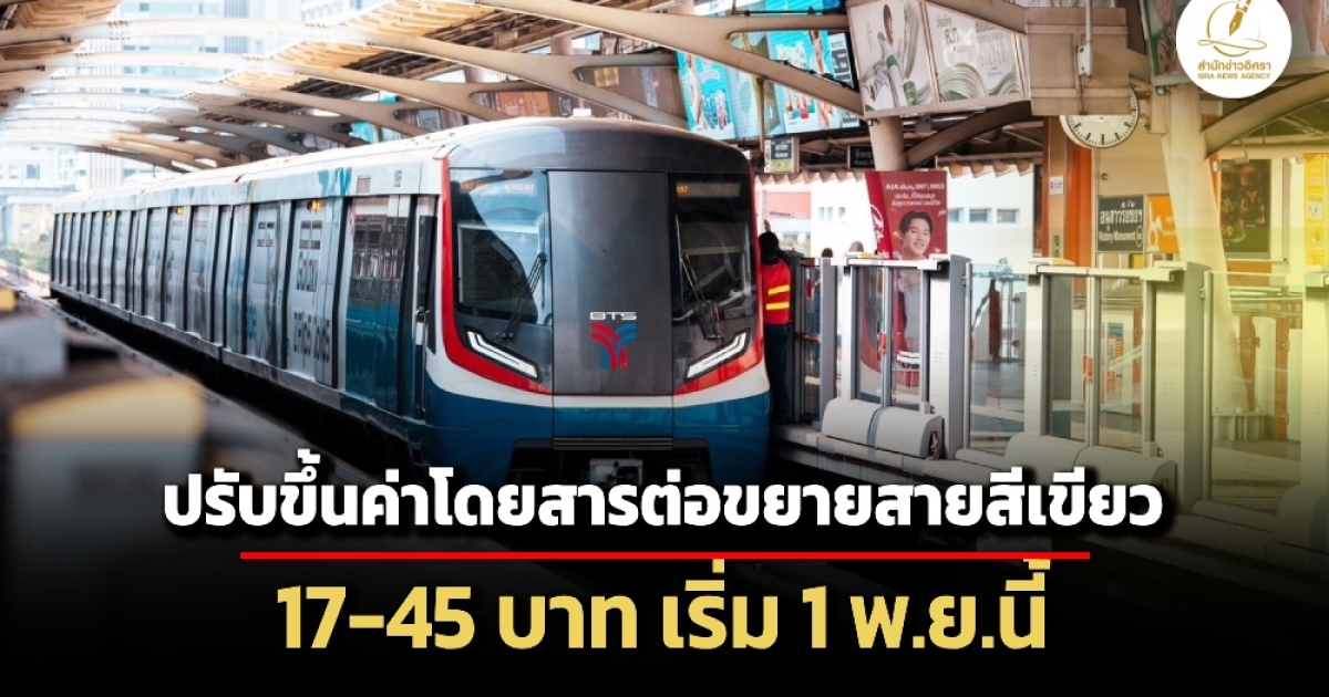 สำนักข่าวอิศรา (www.isranews.org) รายงานว่า วันที่ 23 ตุลาคม 2568 นายวิศณุ ทรัพย์สมพล รองผู้ว่าราชการกรุงเทพมหานคร (กทม.) เปิดเผยว่า กรุงเทพมหานคร (กทม.) เตรียมปรับโครงสร้างอัตราค่าโดยสารโครงการรถไฟฟ้าสายสีเขียวในส่วนต่อขยายทั้งสามช่วง ได้แก่ หมอชิต–คูคต, แบริ่ง–สมุทรปราการ และโพธิ์นิมิตร–บางหว้า โดยจะเริ่มมีผลตั้งแต่วันที่ 1 พฤศจิกายน 2568 เป็นต้นไป