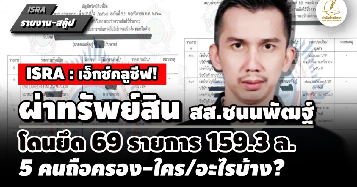 ‘อิศรา’จำแนกละเอียดยิบ ทรัพย์สิน 69 รายการ 159.3 ล. ‘ชนนพัฒฐ์ นาคสั้ว’ สส.สงขลา โดน ปปง.ยึดอายัด คดีฟอกเงิน-เว็บพนัน ทั้ง รถหรู ลัมโบร์ฯ 30 ล. เงินสด 2.1 ล. ที่ดิน 41 แปลง ห้องชุด 20 ห้อง หุ้นนับสิบแห่ง ในชื่อ 5 คนถือครอง แม่ เมีย ใครอีก /อะไรบ้าง?