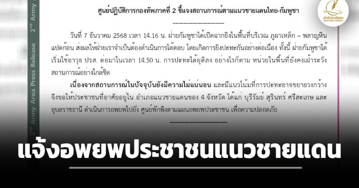 สำนักข่าวอิศรา (www.isranews.org) รายงานว่า เมื่อวันที่ 7 ธ.ค. 2568 ศูนย์ปฏิบัติการกองทัพภาคที่ 2 เผยแพร่ข้อความผ่านเฟซบุ๊ก กองทัพภาคที่ 2 ชี้แจงสถานการณ์ตามแนวชายแดนไทย-กัมพูชาว่า เมื่อวันที่ 7 ธ.ค. 2568 เวลา 14.16 น. ฝ่ายกัมพูชาได้เปิดฉากยิงในพื้นที่บริเวณ ภูผาเหล็ก-พลาญหินแปดก้อน ส่งผลให้ฝ่ายเราจำเป็นต้องดำเนินการโต้ตอบ โดยเกิดการยิงปะทะกันอย่างต่อเนื่อง