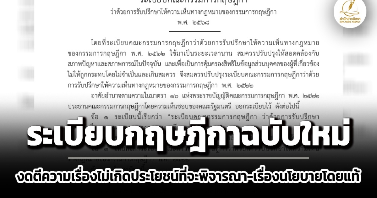 สำนักข่าวอิศรา (www.isranews.org) รายงานว่า เมื่อวันที่ 28 พ.ย. 2568 เว็บไซต์ราชกิจจานุเบกษา แพร่ระเบียบคณะกรรมการกฤษฎีกา ว่าด้วยการรับปรึกษาให้ความเห็นทางกฎหมายของกรรมการกฤษฎีกา พ.ศ. 2568