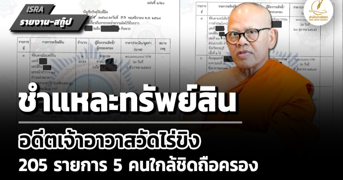 'อิศรา'จำแนกละเอียดยิบ ทรัพย์สิน 205 รายการ 41.68 ล. ‘พระธรรมวชิรา (แย้ม) อดีตเจ้าอาวาสวัดไร่ขิง’ โดน ปปง.ยึดอายัด คดีทุจริตเงินวัด-เว็บพนัน ทั้ง ที่ดิน ห้องชุด รถหรู Benz-Alphard-BMW พระเครื่อง เครื่องประดับ 160 รายการ เงินฝากนับสิบบัญชี ในชื่อ 5 คนถือครอง