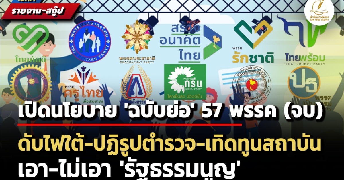 สำนักข่าวอิศรา (www.isranews.org) ได้นำเสนอนโยบาย 'ฉบับย่อ' ในตอนแรก จำนวน 28 พรรคการเมือง ไปแล้ว ต่อไปนี้เป็น 'ตอนจบ' จะเป็นนโยบายของพรรคการเมืองที่เหลือ จำนวน 29 พรรคการเมือง เรียงตามลำดับหมายเลข 29 ถึง หมายเลข 57