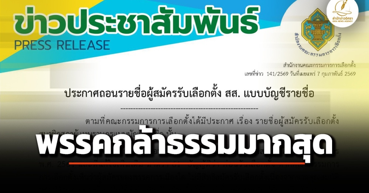 สำนักข่าวอิศรา (www.isranews.org) วันที่ 7 กุมภาพันธ์ 2569 สำนักงานคณะกรรมการการเลือกตั้ง (กกต.) เผยแพร่เอกสารข่าว ศาลฎีกามีคำสั่งให้ถอนชื่อผู้สมัครรับเลือกตั้ง ออกจากประกาศรายชื่อผู้สมัครรับเลือกตั้งสมาชิกสภาผู้แทนราษฎร (สส.) แบบบัญชีรายชื่อ จำนวน 31 ราย แบ่งออกเป็น พรรคกล้าธรรม 4 คน พรรครวมไทยสร้างชาติและพรรคไทยก้าวใหม่ พรรคละ 2 คน พรรคพลังประชารัฐและพรรคประชาธิปัตย์ พรรคละ 1 คน ซึ่งมีนายไชยยศ จิระเมธากร ประชาธิปัตย์ ลำดับ 29 อดีตรมช.ศึกษาธิการสมัยรัฐบาลนายอภิสิทธิ์ เวชชาชีวะ และอดีตรองเลขาธิการนายกรัฐมนตรี ฝ่ายการเมือง สมัยรัฐบาลพล.อ.ประยุทธ์ จันทร์โอชา โดนถอนรายชื่อด้วย โดยมีรายละเอียดทั้งหมด ดังนี้