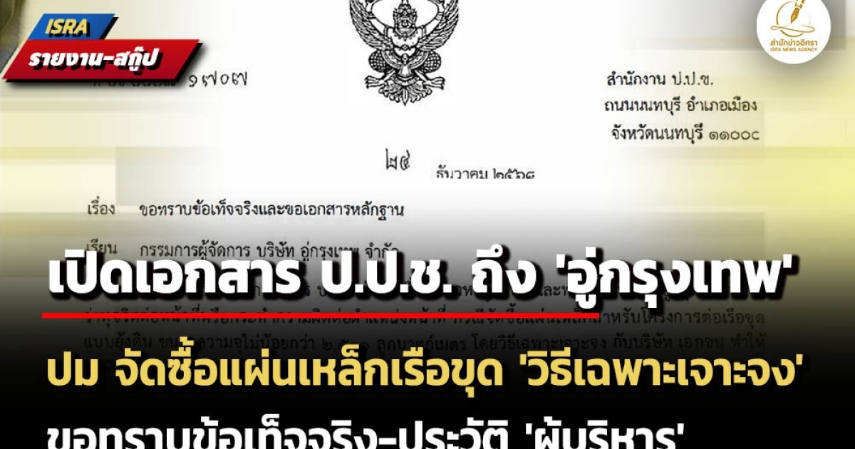โดยหนึ่งในเอกสารที่สำนักข่าวอิศราได้รับ คือ การออกหนังสือสำคัญของหัวหน้าพนักงานไต่สวน สำนักงานไต่สวนการทุจริตภาครัฐรัฐวิสาหกิจ 1 สำนักงานคณะกรรมการป้องกันและปราบปรามการทุจริตแห่งชาติ (ป.ป.ช.) ถึง กรรมการผู้จัดการ บริษัท อู่กรุงเทพ จำกัด เพื่อขอทราบข้อเท็จจริงและขอเอกสารหลักฐาน กรณีจัดซื้อแผ่นเหล็กสำหรับโครงการต่อเรือขุดแบบยุ้งดิน ขนาดความจุไม่น้อยกว่า 2,500 ลูกบาศก์เมตร โดยวิธีเฉพาะเจาะจง เมื่อวันที่ 24 ธันวาคม 2568
