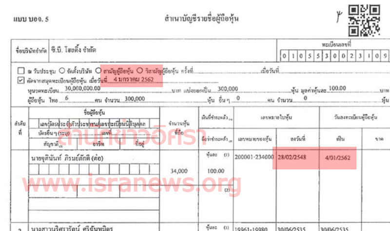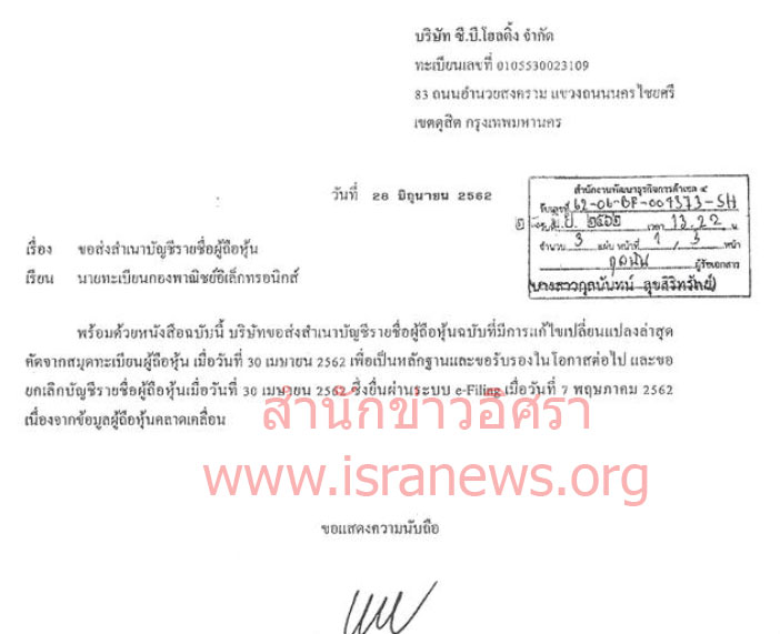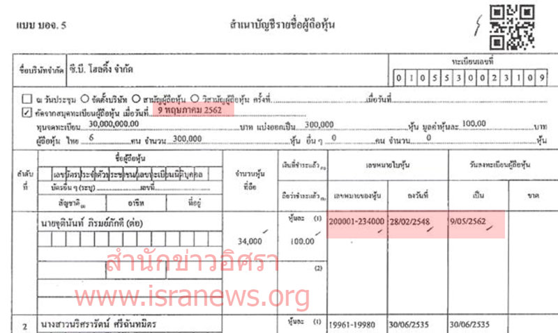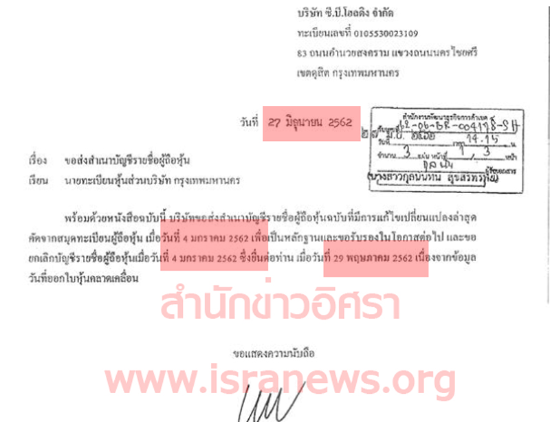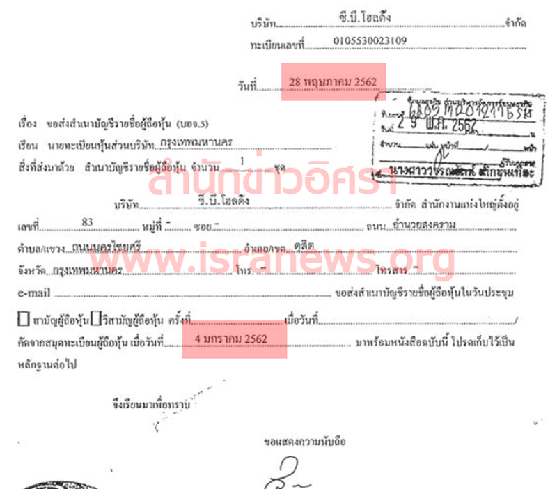 • แก้ไข 4 ครั้ง! ‘ตั๊น’โอนหุ้นให้พ่อ เปลี่ยนวันลงทะเบียนผู้ถือหุ้น 9/05/2562เป็น 4/01/62