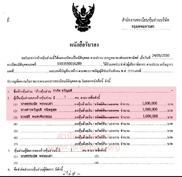 น.ส. ขวัญฤดี กนิษฐสุต ปรากฎลงหุ้นด้วยเงิน 2 ล้านบาท (เพิ่มจากเดิม 1 ล้านบาท)