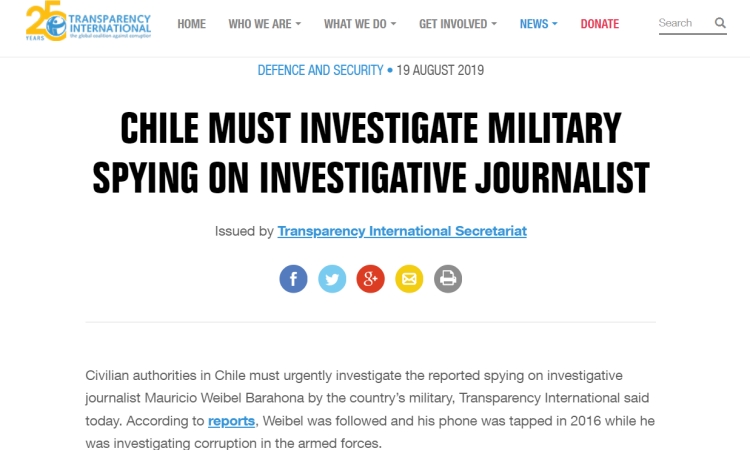 โดยเมื่อวันที่ 19 ส.ค. 2562 หน่วยงานด้านความโปร่งใสนานาชาติ ได้ออกมาเรียกร้องให้หน่วยงานบังคับใช้ของกฎหมายของประเทศชิลี เร่งดำเนินการสืบสวนสอบสวน กรณีที่ปรากฏรายงานว่า ผู้สื่อข่าวสายสืบสวนสอบสวน นายมอริซิโอ เวเบล บาราโฮนา (Mauricio Weibel Barahona) ถูกกองทัพชิลีสอดแนม ทั้งถูกสะกดรอยตาม และดักฟังโทรศัพท์ ในช่วงปี 2559 ซึ่งระหว่างนั้นเขากำลังทำข่าวสืบสวนการทุจริตในกองทัพชิลี