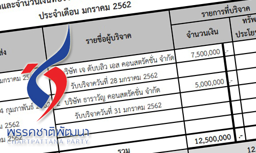 ข้อมูลใหม่! กกต.แพร่ยอดเงินบริจาคพรรคการเมือง พบ บ.ธาราวัญฯ บริจาคให้ชาติพัฒนา ช่วงเดือน ม.ค.-ก.พ. 62 รวม 2 ครั้ง 10 ล้าน ช่วง 'สุรินทร์ ทวีวรรณ์' เป็นกก.