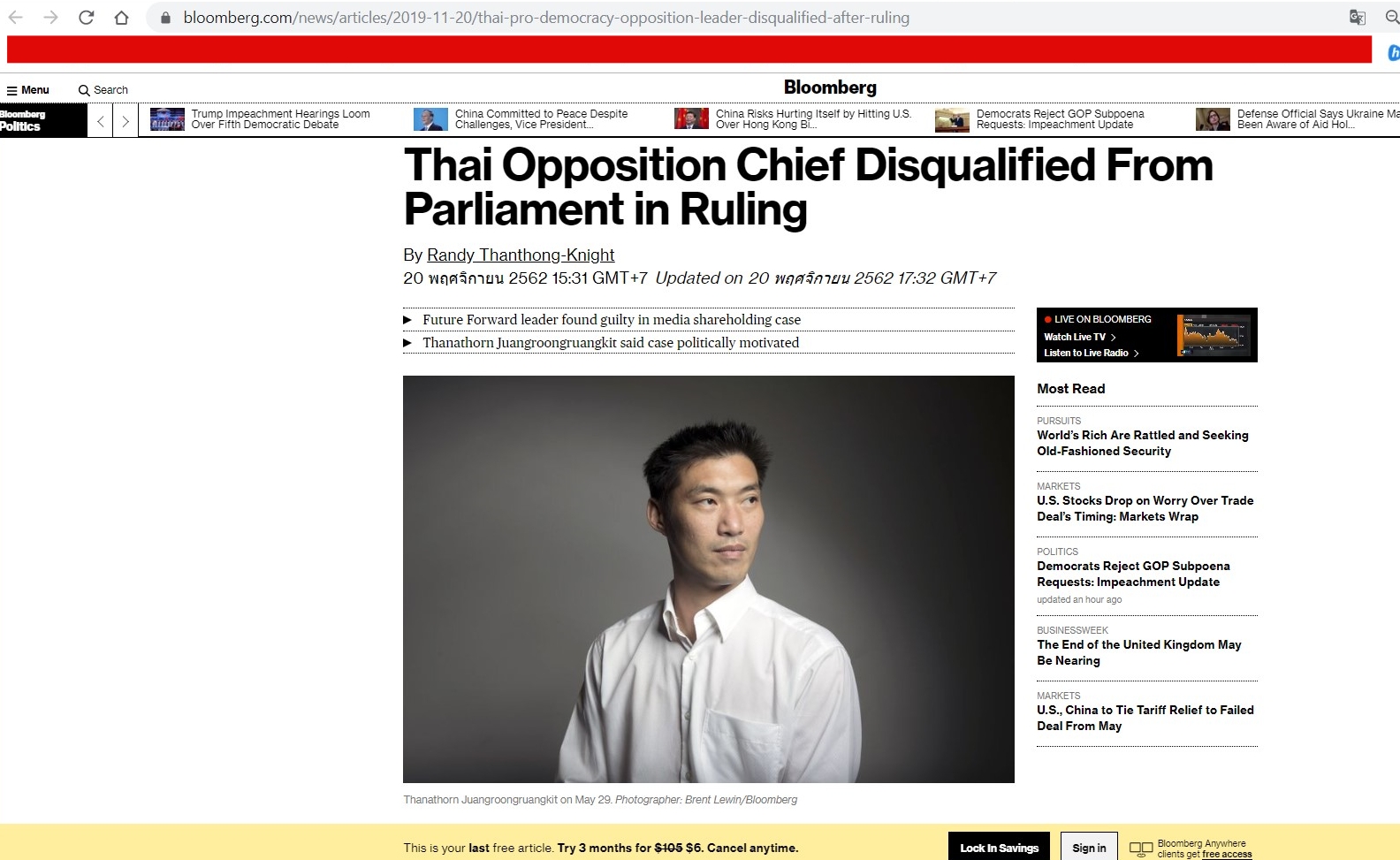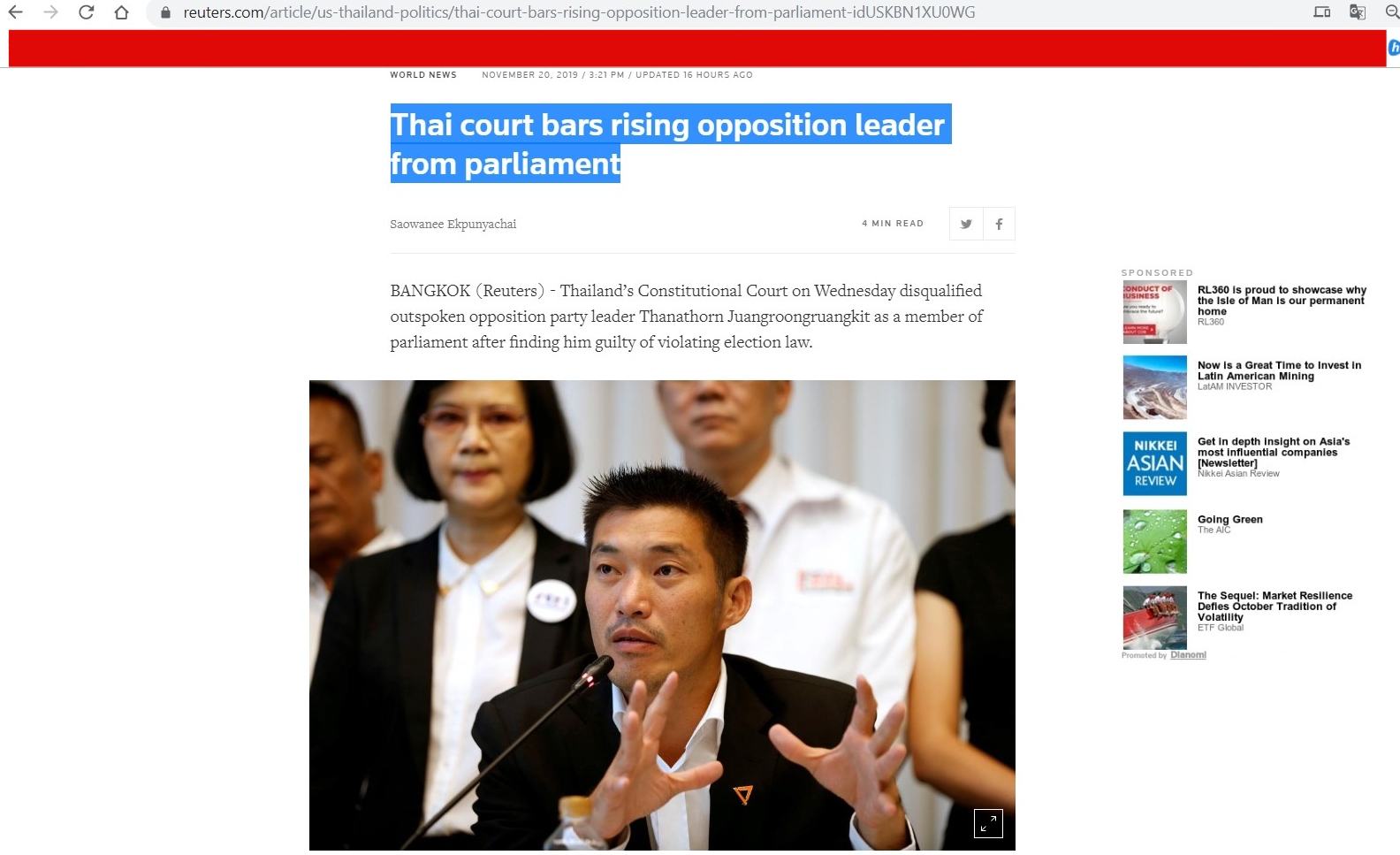 เริ่มจาก สำนักข่าวรอยเตอร์ประเทศอังกฤษ พาดหัวข่าวว่า "Thai court bars rising opposition leader from parliament" หรือแปลเป็นไทยว่า "ศาลไทยได้ขัดขวางไม่ให้หัวหน้าพรรคฝ่ายค้านดาวรุ่งเข้าสู่สภา"