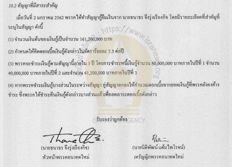 หนึ่ง พรรคอนาคตใหม่ แจ้งในหมายเหตุงบการเงิน ข้อ 10.2 สัญญาที่มีสาระสำคัญ ระบุว่า เมื่อวันที่ 2 ม.ค. 2562 พรรคทำสัญญากู้ยืมเงินจาก นายธนาธร จึงรุ่งเรืองกิจ โดยมีรายละเอียดสำคัญว่า 1.จำนวนเงินต้นของเงินกู้เป็นจำนวน 161.2 ล้านบาท 2.กำหนดคิดดอกเบี้ยเงินกู้ดังกล่าวในอัตราร้อยละ 7.5 ต่อปี 3.พรรคจะชำระเงินกู้ตามสัญญานี้ภายใน 3 ปี โดยการชำระหนี้เงินกู้จำนวน 80 ล้านบาทภายในปีที่ 1 จำนวน 40 ล้านบาทภายในปีที่ 2 และจำนวน 41.2 ล้านบาทภายในปีที่ 3 และ 4.หากพรรคชำระเงินกู้บางส่วนในระหว่างสัญญา คู่สัญญาตกลงให้คำนวณดอกเบี้ยจากยอดเงินกู้ที่พรรคยังคงค้างชำระ ซึ่งพรรคได้ชำระคืนเงินกู้ดังกล่าวบางส่วนแล้ว เพื่อลดภาระดอกเบี้ยดังกล่าว
