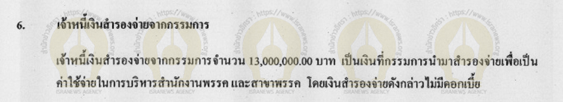 สอง พรรคเพื่อไทย ระบุในหมายเหตุงบการเงินในส่วนหนี้สินหมุนเวียนว่า มีเจ้าหนี้เงินสำรองจ่ายจากกรรมการ วงเงิน 13 ล้านบาท โดยระบุว่าเงินดังกล่าว เป็นเงินที่กรรมการนำมาสำรองจ่ายเพื่อเป็นค่าใช้จ่ายในการบริหารสำนักงานพรรค และสาขาพรรค โดยเงินสำรองจ่ายดังกล่าวไม่มีดอกเบี้ย