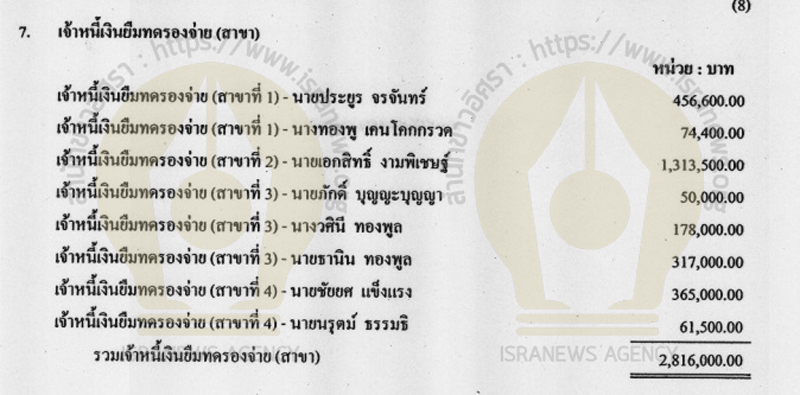 เจ็ด พรรคพลังชล ระบุในหมายเหตุงบการเงินในส่วนหนี้สินหมุนเวียนว่า มีเจ้าหนี้เงินยืมทดรองจ่าย (สาขา) วงเงิน 2,816,000 บาท รวม 8 ราย
