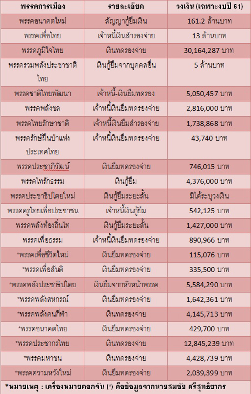 สำนักข่าวอิศรา www.isranews.org รวบรวมรายละเอียดข้อมูลทั้งหมดตามรายงานงบการเงินของพรรคการเมืองประจำปี 2561 ประกอบกับข้อมูลจากแหล่งอื่น ๆ พบว่า มีพรรคการเมืองอย่างน้อย 23 พรรค แจ้งหนี้สินในส่วนกู้ยืมเงิน โดยระบุเหตุผลดังต่อไปนี้