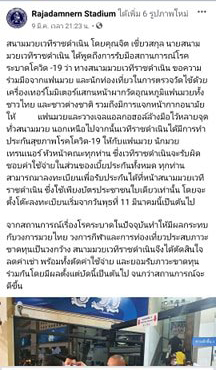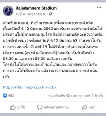 จากนั้น วันที่ 18 มี.ค.เพจ Rajadamnern Stadium มีการแจ้งประกาศ ให้แฟนมวย ที่มาเข้าชมมวย ที่สนามราชดำเนิน ตั้งแต่วันที่ 6- 12 มี.ค.2563 ไปตรวจหาเชื้อโรคโควิด -19 ได้ฟรี ที่ สถาบันควบคุมโรคเขตบางเขน