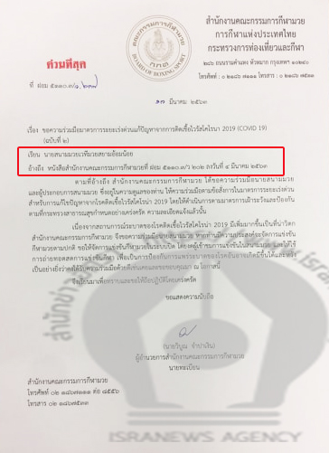 โดยอ้างถึงหนังสือฉบับลงวันที่ 4 มี.ค.2563 ที่แจ้งขอความร่วมมือมาตรการเร่งด่วนแก้ไขปัญหาการติดเชื้อไวรัสโคโรน่า โดยอ้างคำสั่งตามมติคณะรัฐมนตรี (ครม.) เมื่อวันที่ 3 มี.ค.2563 ให้หลีกเลี่ยง หรือเลื่อนการจัดกิจกรรมเช่นการจัดการแข่งขันกีฬา ที่ส่งมาให้รับทราบแล้ว (ดูเอกสารประกอบ)