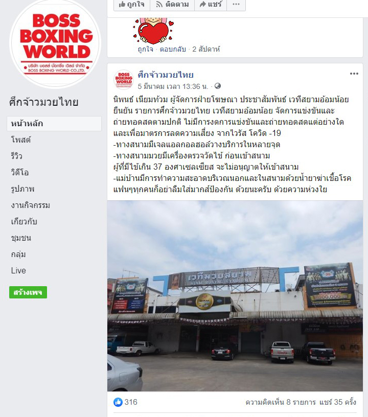 2. สำนักข่าวอิศรา ตรวจสอบข้อมูลในแฟนเพจ ศึกจ้าวมวยไทย ของ บริษัท บอสส์ บ๊อกซิ่ง 2000 จำกัด พบว่า ในช่วงหลังจากวันที่ 4 มี.ค.2563 สนามเวทีมวยสยามอ้อมน้อย มีการจัดแข่งขันชกมวย 1 รายการ คือ รายการศึกจ้าวมวยไทย วันที่ 7 มี.ค.2563