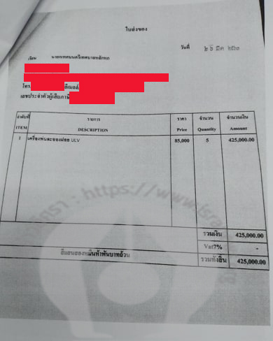 - เครื่องพ่นละอองฝอย ULV จำนวน 5 เครื่อง ราคาเครื่องละ 85,000 บาท รวมวงเงิน 425,000 บาท