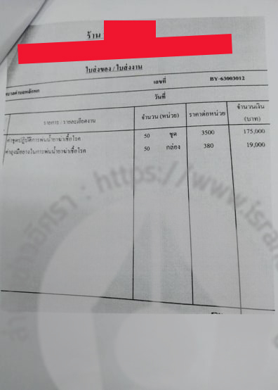 - ค่าชุดปฏิบัติการพ่นน้ำยาฆ่าเชื้อโรค 50 ชุด ราคาต่อหน่วย 3,500 บาท รวมเป็นเงิน 175,000 บาท