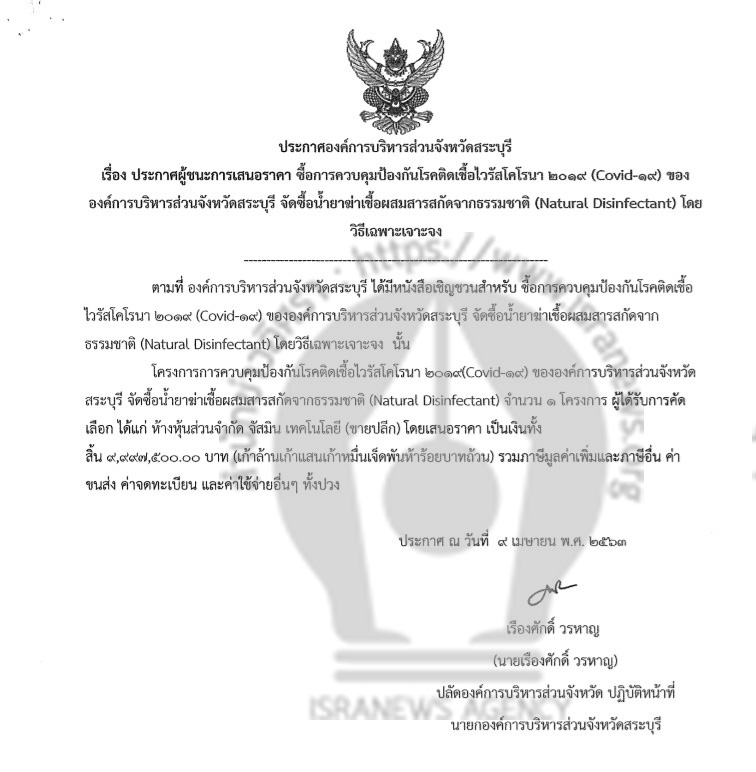 หลังจากที่ก่อนหน้านั้นเมื่อวันที่ 1 เม.ย.2563 อบจ.สระบุรี ได้ประกาศผลจัดซื้อน้ำยาฆ่าเชื้อผสมสารสกัดจากธรรมชาติ วงเงิน 9,997,500 บาท โดยวิธีเฉพาะเจาะจง จากห้างหุ้นส่วนจำกัด (หจก.) จัสมิน เทคโนโลยี มาแล้ว
