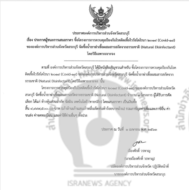 1. วันที่ 9 เม.ย.2563 ประกาศผลจัดซื้อน้ำยาฆ่าเชื้อผสมสารสกัดจากธรรมชาติ วงเงิน 9,997,500 บาท โดยวิธีเฉพาะเจาะจง จากห้างหุ้นส่วนจำกัด (หจก.) จัสมิน เทคโนโลยี