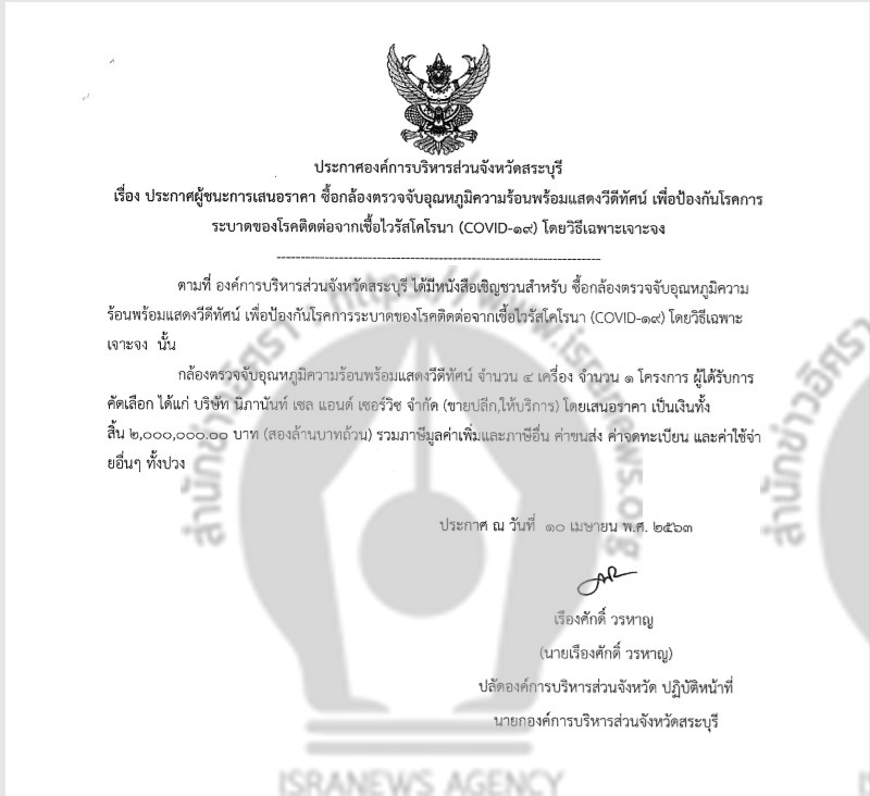 3. วันที่ 10 เม.ย.2563 ประกาศผลจัดซื้อกล้องตรวจจับอุณหภูมิความร้อมพร้อมแสดงวีดีทัศน์เพื่อป้องกันโรคโควิด จำนวน 4 เครื่องๆ ละ 5 แสนบาท รวมวงเงิน 2 ล้านบาท โดยวิธีเฉพาะเจาะจง จากบริษัท นิภานันท์ เซล แอนด์ เซอร์วิซ จำกัด