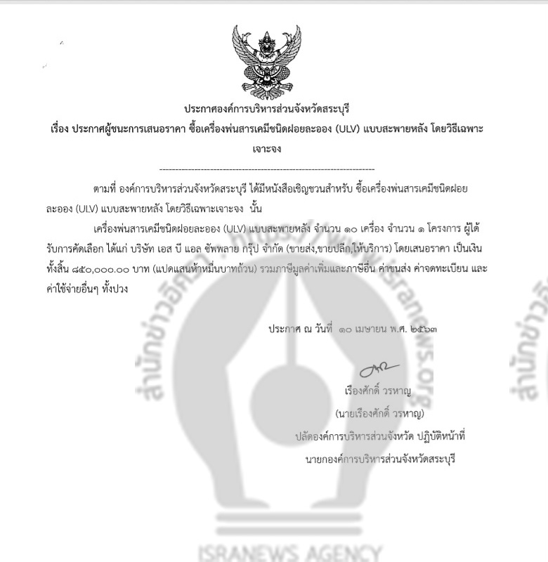 2. วันที่ 10 เม.ย.2563 ประกาศผลจัดซื้อเครื่องพ่นสารเคมีชนิดฝอยละออง (ULV) แบบสายสะพายหลัง จำนวน 10 เครื่อง วงเงิน 850,000 บาท เฉลี่ยเครื่องละ 85,000 บาท โดยวิธีเฉพาะเจาะจง จาก บริษัท เอส บี แอล ซัพพลาย กรุ๊ป จำกัด