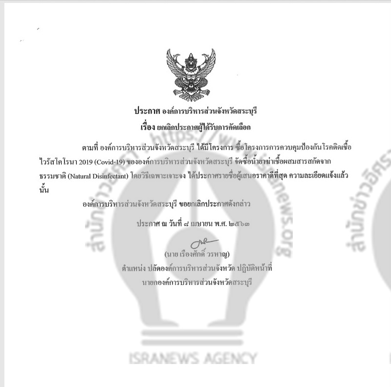 ทั้งนี้ ในส่วนการจัดซื้อน้ำยาฆ่าเชื้อผสมสารสกัดจากธรรมชาติ ของ อบจ.สระบุรี นั้น จากการตรวจสอบพบว่า เมื่อวันที่ 8 เม.ย.2563 อบจ.สระบุรี ได้ประกาศผลยกเลิกการจัดซื้อน้ำยาฆ่าเชื้อผสมสารสกัดจากธรรมชาติ โดยไม่ได้แจ้งสาเหตุ