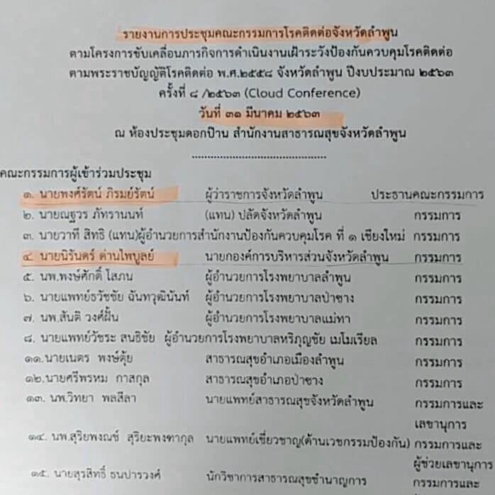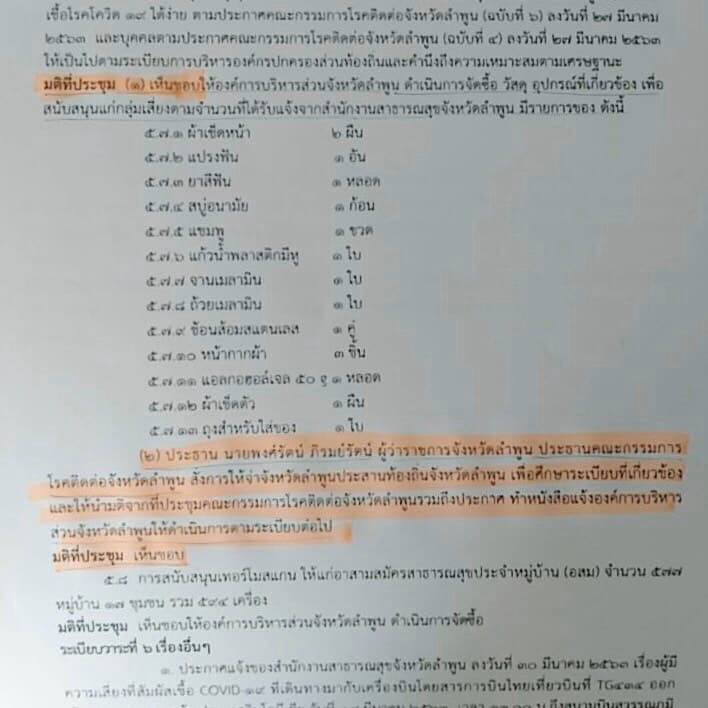 " ในการประชุมคณะกรรมการโรคติดต่อจังหวัดลำพูน ครั้งที่ 8/2563 วันที่ 31 มี.ค.2563 ที่ประชุมได้รับทราบสถานการณ์การป้องกันโรคโควิด และมาตรการของศูนย์บริหารสถานการณ์การแพร่ระบาดของโรคติดเชื้อไวรัสโคโรนา 2019 (ศบค.) เกี่ยวกับการให้ผู้สูงอายุ 70 ปี ต้องพักอาศัยอยู่ในบ้าน ห้ามออกไปไหน โดยไม่จำเป็นเพราะเป็นความเสี่ยง ทางจังหวัดก็มีการรับเรื่องมาพิจารณาและมีมติรับหลักการมาปฏิบัติ ในการให้ควบคุมดูแลผู้สูงอายุ พักอาศัยอยู่ในบ้าน ห้ามออกไปไหน ซึ่งในการประชุมวันนั้น มีตัวแทนจากหน่วยงานสาธารณสุขเสนอว่า ถ้าจะให้กลุ่มผู้สูงอายุอยู่แต่ในบ้าน ก็ควรมีการจัดซื้ออุปกรณ์ที่จำเป็นให้หน่อย เพื่อให้คนกลุ่มนี้แยกตัวไม่ใช้ของปะปนกับสมาชิกในบ้าน ที่ประชุมจึงมีมติเห็นชอบกับแนวทางนี้ และรับหลักการให้ซื้อของจำเป็น แต่การดำเนินการจะต้องเป็นไปตามระเบียบ ให้ท้องถิ่นไปตรวจสอบดู แต่ไม่ได้มีการระบุรายละเอียดสินค้า 13 รายการแต่อย่างใด ซึ่งในการประชุมครั้งต่อมา เมื่อมีการตรวจสอบพบการเขียนรายงานการประชุมในลักษณะดังกล่าว ก็ได้มีการสอบถามเจ้าหน้าที่ ก็พบว่า เป็นการเขียนโดยพลการของฝ่ายเลขานุการ ซึ่งเป็นคนจากสธ."