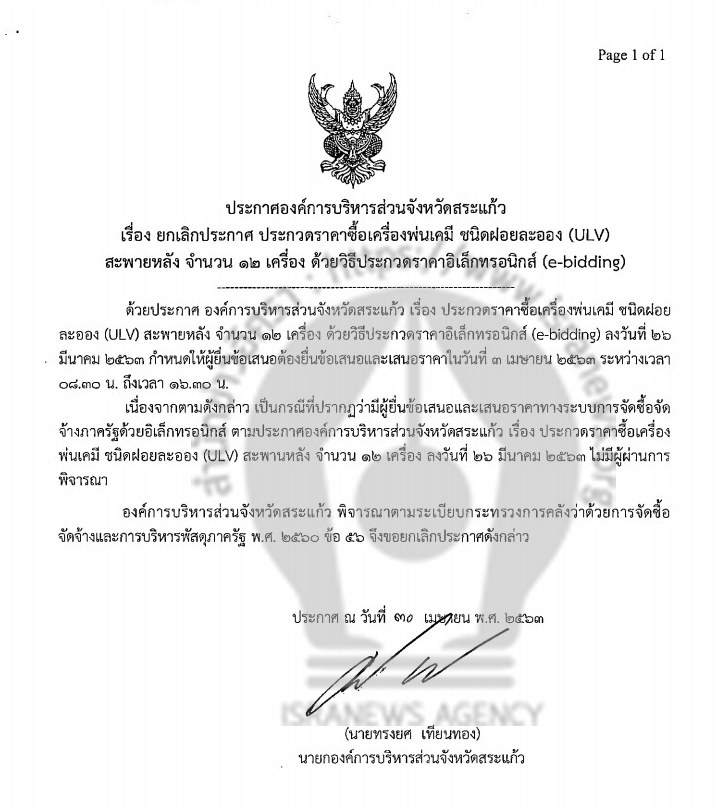โดยล่าสุด จากการตรวจสอบฐานข้อมูลจัดซื้อจัดจ้างหน่วยงานภาครัฐ พบว่า เมื่อวันที่ 1 พ.ค.2563 ที่ผ่านมา องค์การบริหารส่วนจังหวัด (อบจ.) สระแก้ว ได้เผยแพร่ประกาศประกวดราคาจัดซื้อเครื่องพ่นเคมีชนิดฝอยละออง (ULV) สะพายหลังจำนวน 12 เครื่อง