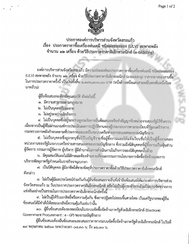 "...ล่าสุด จากการตรวจสอบฐานข้อมูลจัดซื้อจัดจ้างหน่วยงานภาครัฐ พบว่า เมื่อวันที่ 1 พ.ค.2563 ที่ผ่านมา องค์การบริหารส่วนจังหวัด (อบจ.) สระแก้ว ได้เผยแพร่ประกาศประกวดราคาจัดซื้อเครื่องพ่นเคมีชนิดฝอยละออง (ULV) สะพายหลังจำนวน 12 เครื่อง ตั้งราคากลางอยู่ที่ 1,136,000 บาท เฉลี่ยเครื่องละ 94,675 บาท ด้วยวิธีประกวดราคาอิเล็กทรอนิกศ์ (e-bidding) กำหนดให้เอกชนที่สนใจยื่นข้อเสนอและราคา ในวันที่ 19 พ.ค.2563 นี้ ..."
