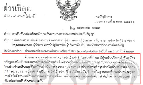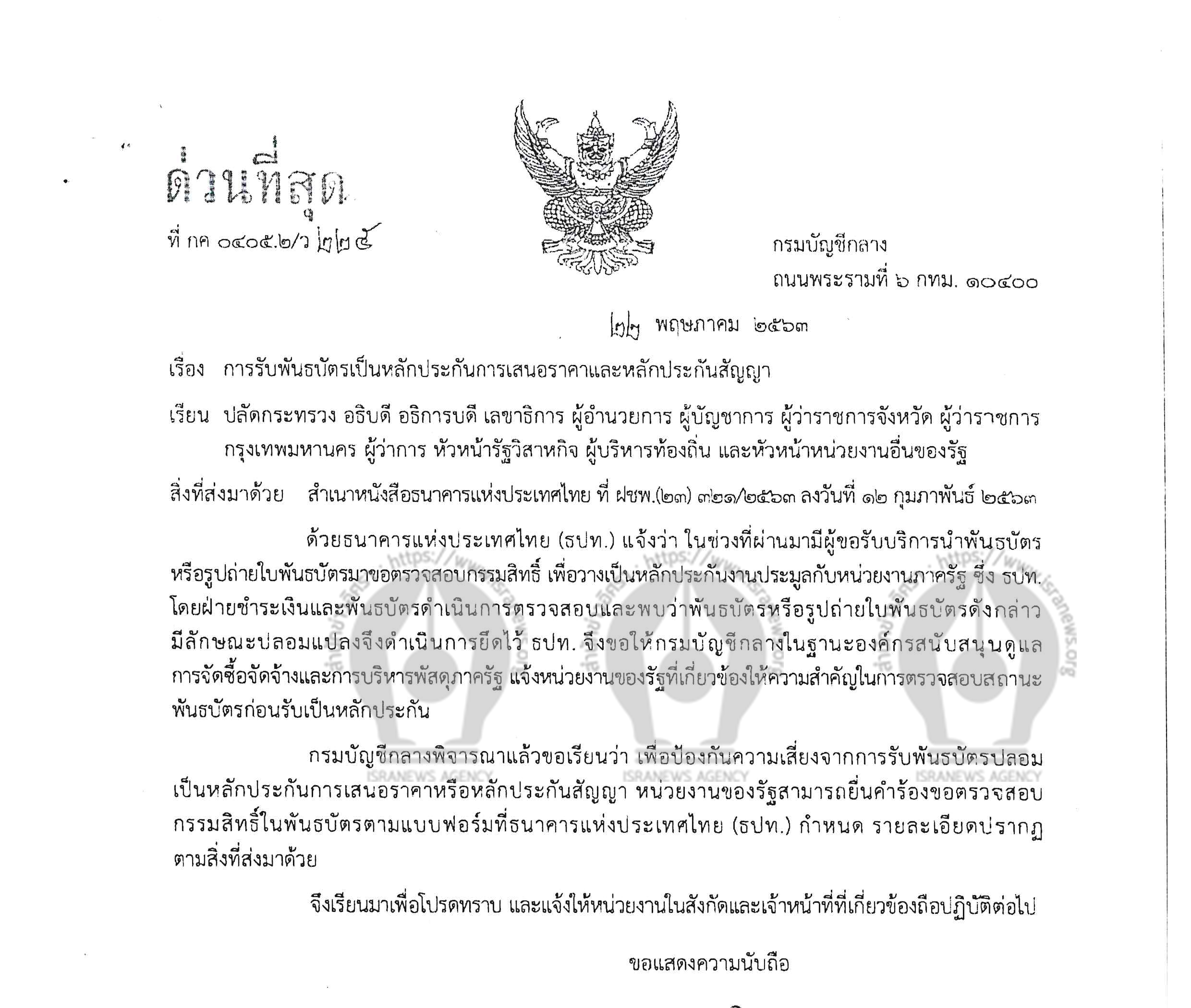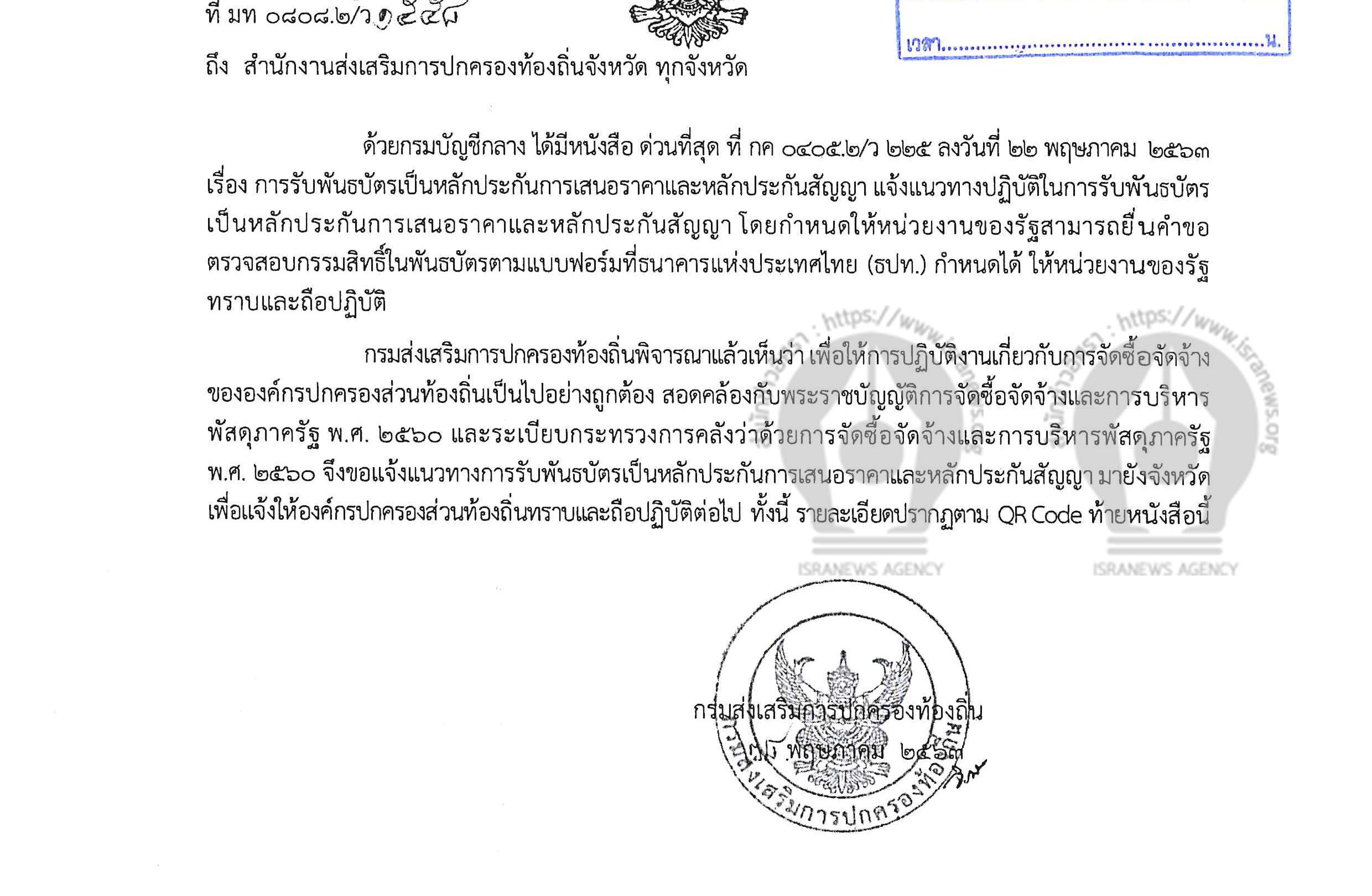สำนักข่าวอิศรา (www.isranews.org) ตรวจสอบพบว่า เมื่อเร็วๆ นี้ กรมส่งเสริมการปกครองท้องถิ่น (สถ.) ได้ทำหนังสือเวียนแจ้งถึง สำนักงานส่งเสริมการปกครองท้องถิ่นจังหวัด (สถ.จังหวัด) ทุกจังหวัด เพื่อให้รับทราบแนวทางปฏิบัติในการรับพันธบัตรเป็นหลักประกันการเสนอราคาและหลักประกันสัญญา ที่จะต้องมีการยื่นคำร้องต่อธนาคารแห่งประเทศไทย (ธปท.) ให้ตรวจสอบสถานะความถูกต้องของหลักประกันการเสนอราคาและหลักประกันสัญญาก่อน เพื่อป้องกันปัญหาการปลอมแปลงเกิดขึ้น