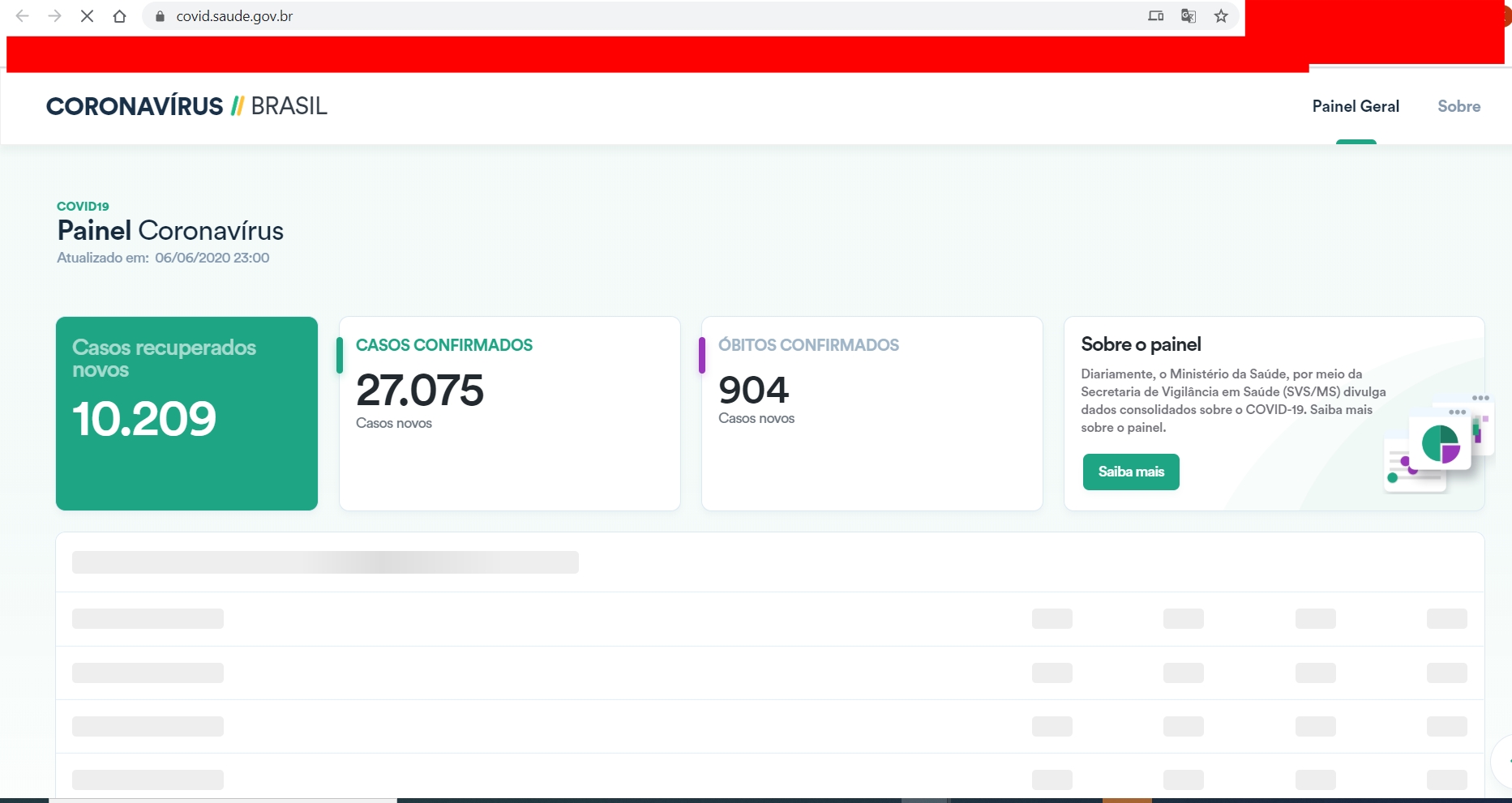 สำนักข่าวอิศรา (www.isranews.org) รายงานความคืบหน้าล่าสุดสถานการณ์การแพร่ระบาดของโรคโควิด-19 หรือโคโรน่าไวรัส เมื่อวันที่ 7 มิ.ย. ว่า ที่ประเทศบราซิล มีรายงานว่าเว็บไซต์กระทรวงสาธารณสุขของประเทศบราซิล ได้นำข้อมูลภาพรวมของผู้ติดเชื้อโควิดสะสมทั้งประเทศออกจากเว็บไซต์ ตามคำสั่งของนายฌาอีร์ โบลโซนารู ประธานาธิบดีบราซิล (ดูภาพประกอบ)