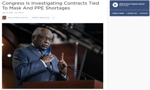 โดยเมื่อวันที่ 15 ก.ค.ที่ผ่านมา สถานีวิทยุสาธารณะแห่งชาติของสหรัฐ (National Public Radio หรือ NPR) ได้รายงานข่าวอ้างอิงข้อมูลหนังสือราชการของสภาคองเกรส ระบุว่าคณะกรรมการสอบสวนของสภาคองเกรสได้เริ่มกระบวนการไต่สวนบริษัทจำนวนหนึ่งที่ได้รับสัญญาจากรัฐบาลในการจัดซื้ออันเกี่ยวข้องกับไวรัสโควิด 19 เนื่องจากพบข้อพิรุธเกี่ยวกับการทำสัญญาจัดซื้อจัดจ้างของบริษัทเหล่านี้ อาทิ บริษัทบางแห่งขาดประสบการณ์ในการจัดหาเวชภัณฑ์ และยังพบว่าบางบริษัทก็มีเส้นสายทางการเมืองใกล้ชิดกับทีมบริหารของนายโดนัลด์ ทรัมป์ ประธานาธิบดีสหรัฐฯ