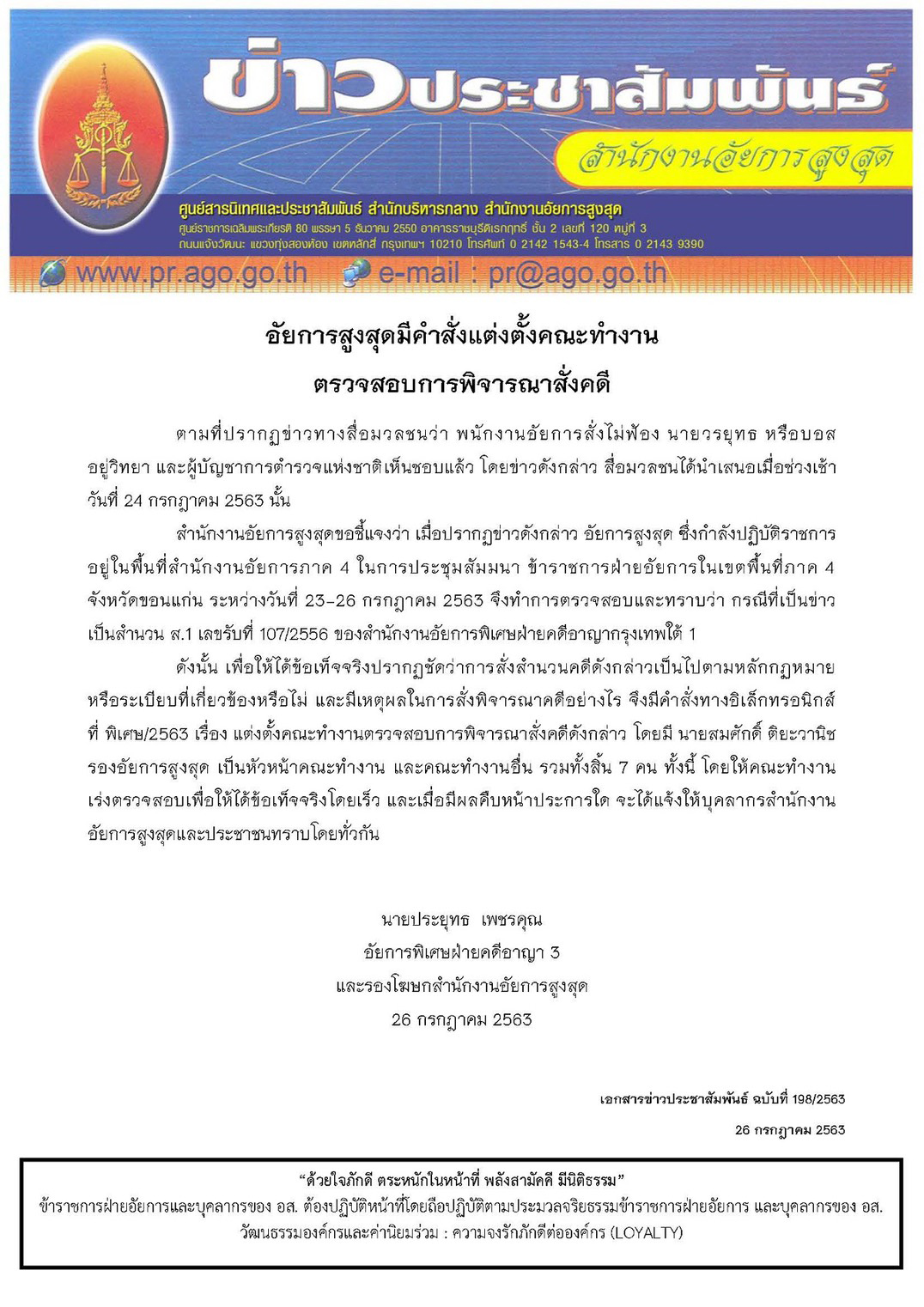 ดังนั้นเพื่อให้ข้อเท็จจริงปรากฏชัดว่า การสั่งสำนวนคดีดังกล่าวเป็นไปตามหลักกฎหมาย หรือระเบียบที่เกี่ยวข้องหรือไม่ และมีเหตุผลในการสั่งพิจารณาคดีอย่างไร จึงมีคำสั่งทางอิเล็กทรอนิกส์ที่ พิเศษ/2563 เรื่อง แต่งตั้งคณะทำงานตรวจสอบการพิจารณาสั่งคดีดังกล่าว โดยมีนายสมศักดิ์ ติยะวานิช รอง อสส. เป็นหัวหน้าคณะทำงาน และคณะทำงานอื่น รวม 7 ราย โดยให้คณะทำงานเร่งตรวจสอบเพื่อให้ได้ข้อเท็จจริงโดยเร็ว และเมื่อมีผลคืบหน้าประการใด จะได้แจ้งให้บุคลากรสำนักงาน อสส. และประชาชนทราบโดยทั่วกัน
