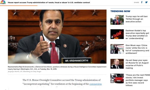 โดยเมื่อวันที่ 31 ก.ค.ที่ผ่านมา สำนักข่าวหลายแห่งในสหรัฐอเมริกา ได้รายงานข่าวกรณีที่ คณะกรรมการกำกับดูแลและปฏิรูปซึ่งทำหน้าที่เป็นคณะกรรมการสอบสวนหลักของสภาผู้แทนราษฎรแห่งสหรัฐอเมริกา ได้ออกมากล่าวโทษทีมงานบริหารของนายโดนัลด์ ทรัมป์ ประธานาธิบดีสหรัฐฯว่าไร้ความสามารถในการเจรจาต่อรองในการจัดซื้อจัดจ้างเครื่องช่วยหายใจในช่วงแรกของการระบาด โดยระบุว่ามีการใช้จ่ายเงินภาษีเกินความจำเป็นไปมากถึง 500 ล้านดอลลาร์สหรัฐฯ (15,630,000,000 บาท) ในการซื้ออุปกรณ์ที่จำเป็นต่างๆ